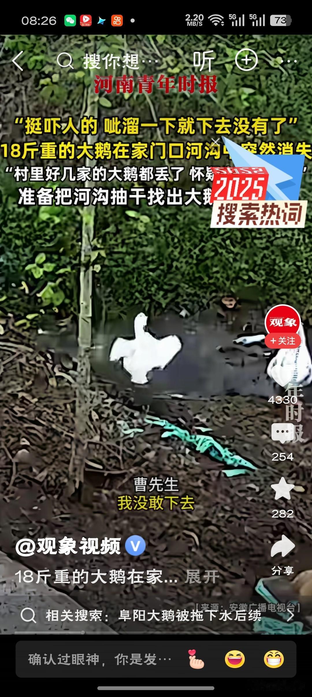 18斤大鹅在家门口河沟突然消失家门口的河沟藏龙卧虎,十八斤的大鹅转眼没了踪影——