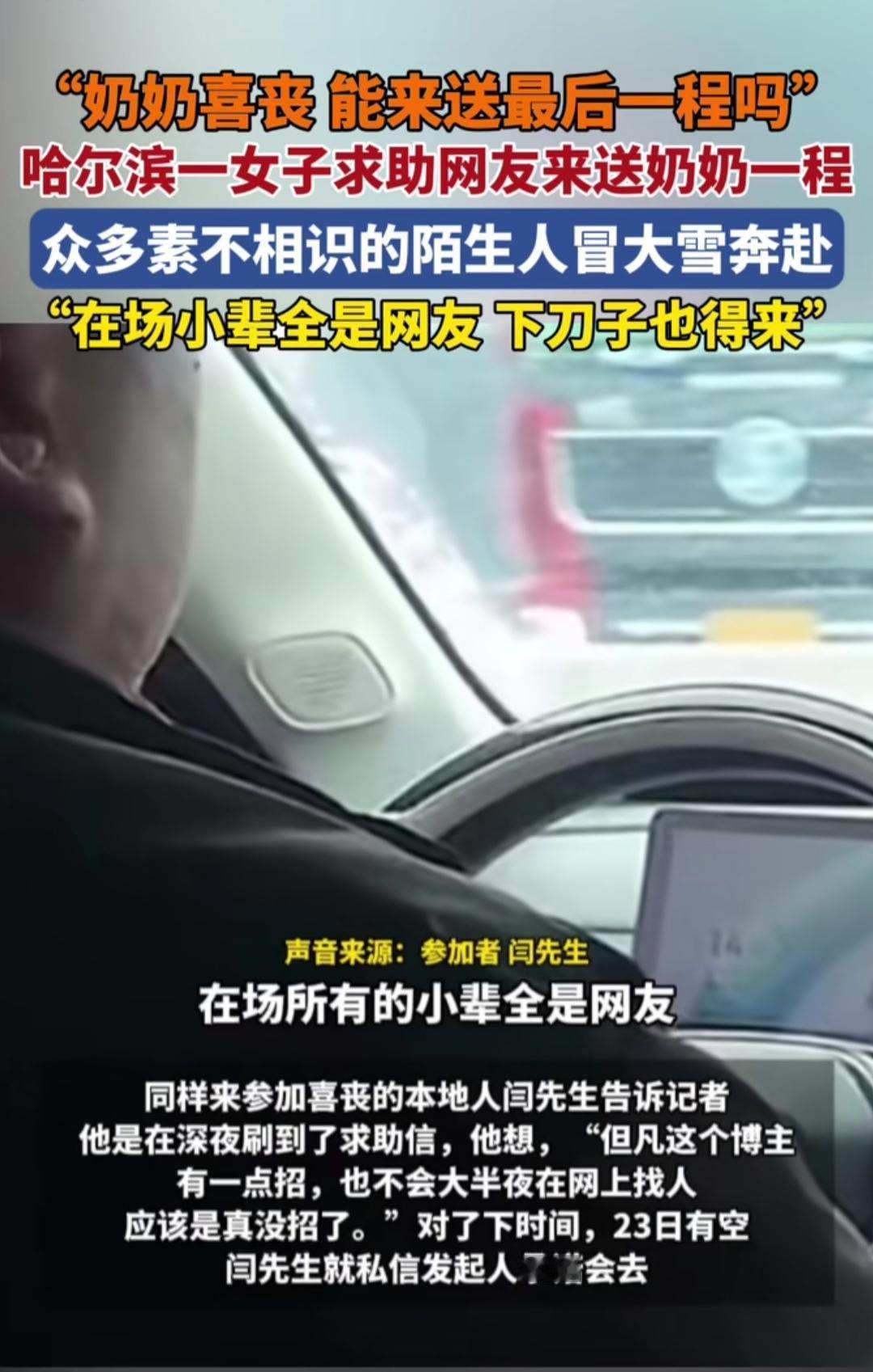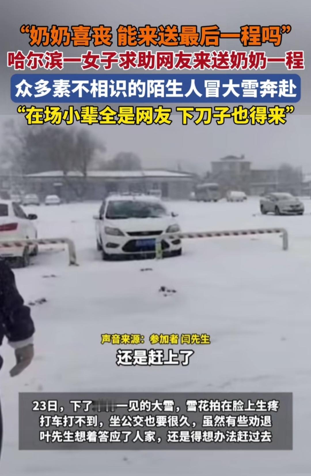 你有没有想过,网络另一端的陌生人,会在你最无助的时候,为你奔赴一场素不相识的告别?哈尔滨一位姑娘的求助信,最近看哭了好多人,她90岁的奶奶走了,是喜丧,可她身边没什么朋友,想求网友来送奶奶最后一程。 谁也没想到,消息发出去后,一群素不相识的人顶着鹅毛大雪赶来了。有人凌晨七点就出门,打不到车就徒步走;有人说“下刀子也得来”,就为了给陌生的老人鞠个躬。现场的小辈,竟然全是素未谋面的网友。 姑娘说奶奶把她带大不容易,不想奶奶走得孤单。而这些陌生人,只是看懂了这份遗憾,便愿意放下手头的事,穿越风雪赴一场温暖的约。 总有人说网络是冰冷的,可偏偏是这些素昧平生的善意,在哈尔滨的寒冬里,捂热了人心。原来人与人之间的联结,从不是靠熟悉与否,而是靠那份藏在心底的温柔与共情。