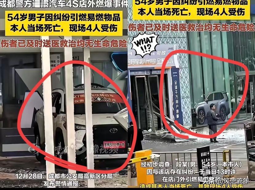 快过年了,成都发生一起悲剧。 54岁的老段开车冲进4S店自杀,四名路人被砸受伤