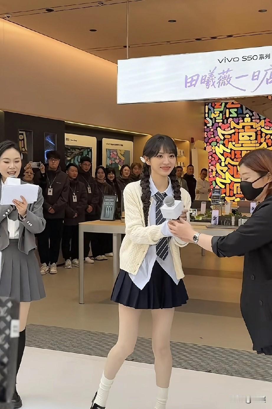 在武汉楚河汉街的vivo活动现场,田曦薇以青春活力的造型亮相,双麻花辫搭配学院风穿搭,甜美又俏皮 身旁的搭档也身着精致套装,二人同框互动超有氛围感~现场还有不少观众围观,氛围热闹,这样的线下活动谁能不爱呢~