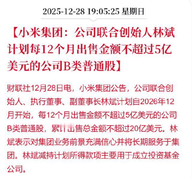 突然 !小米联合创始人林斌计划大幅套现?据小米公告,小米联合创始人林斌计划从2026年12月开始,每12个月出售金额不超过5亿美元的公司B类普通股。 林斌强调,对小米集团业务前景充满信心,并将长期服务于集团,林斌表示减持计划所得款项主要用于成立投资基金公司