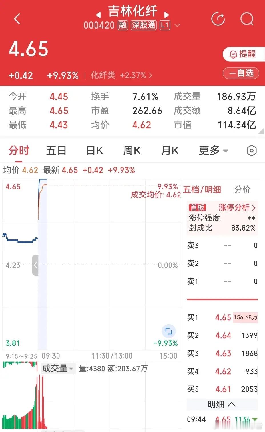 早盘分享吉林化纤直接高开秒板,这波冲劲太猛了!日线周线月线横盘了这么久,今天算是彻底突破箱体了!后续怎么走全看主力实力,不过溢价基本稳了。可惜啊可惜,我又没买到!最近总盯着便宜货,错过好多大肉😭