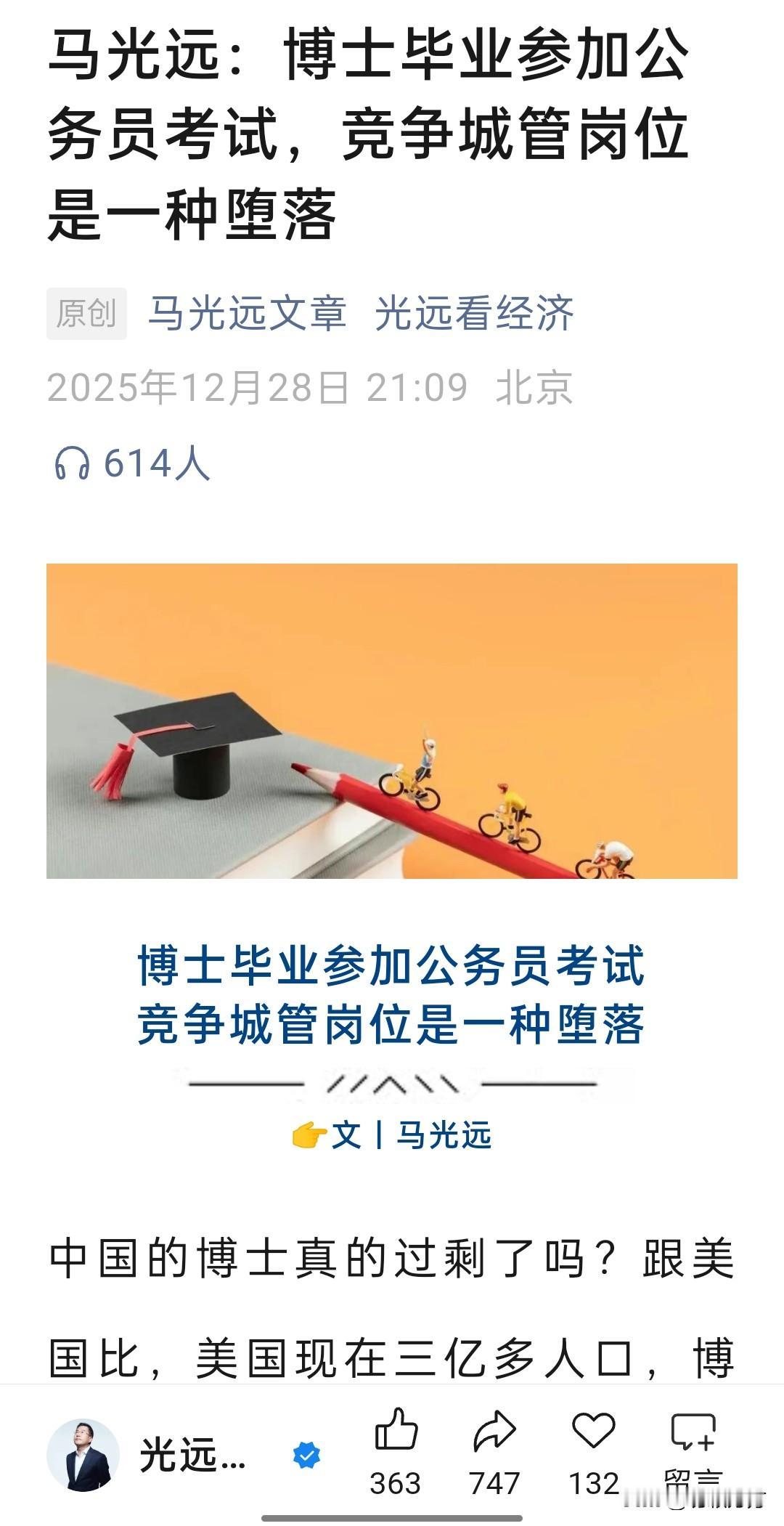 经济学者马光远说“博士毕业参加公务员考试,竞争城管岗位是一种堕落”,因为很多公务