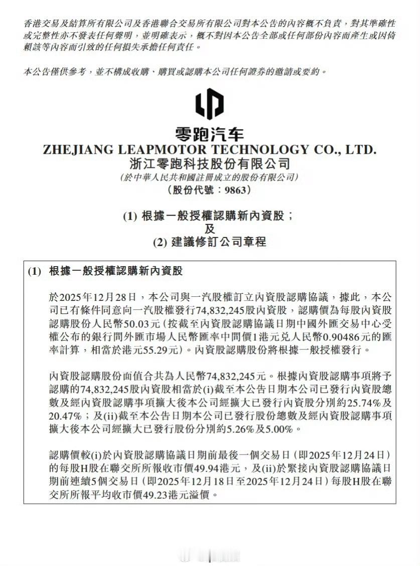 一汽股权认购零跑近7500万股传了好久,一汽入股零跑的传闻终于落地了。7500万股,每股55.29港元,耗资超过41亿港元,对于一起来说也是一大笔钱。虽然是溢价认购(其实真的未必溢价,这种大的股权投资也不是几天就决定的,当时零跑的股价大概率是高于55港元的,只是最近几个月跌的太厉害了。),但是合作对于双方都是有利的,零跑的品牌力增加了,一汽也增加了新能源的属性。今天是港股汽车股大涨,只有小米在挨打,也不知道洗林斌减持的人到底是啥心理,唯一可以确定的是他们没有小米股票。老张聊车