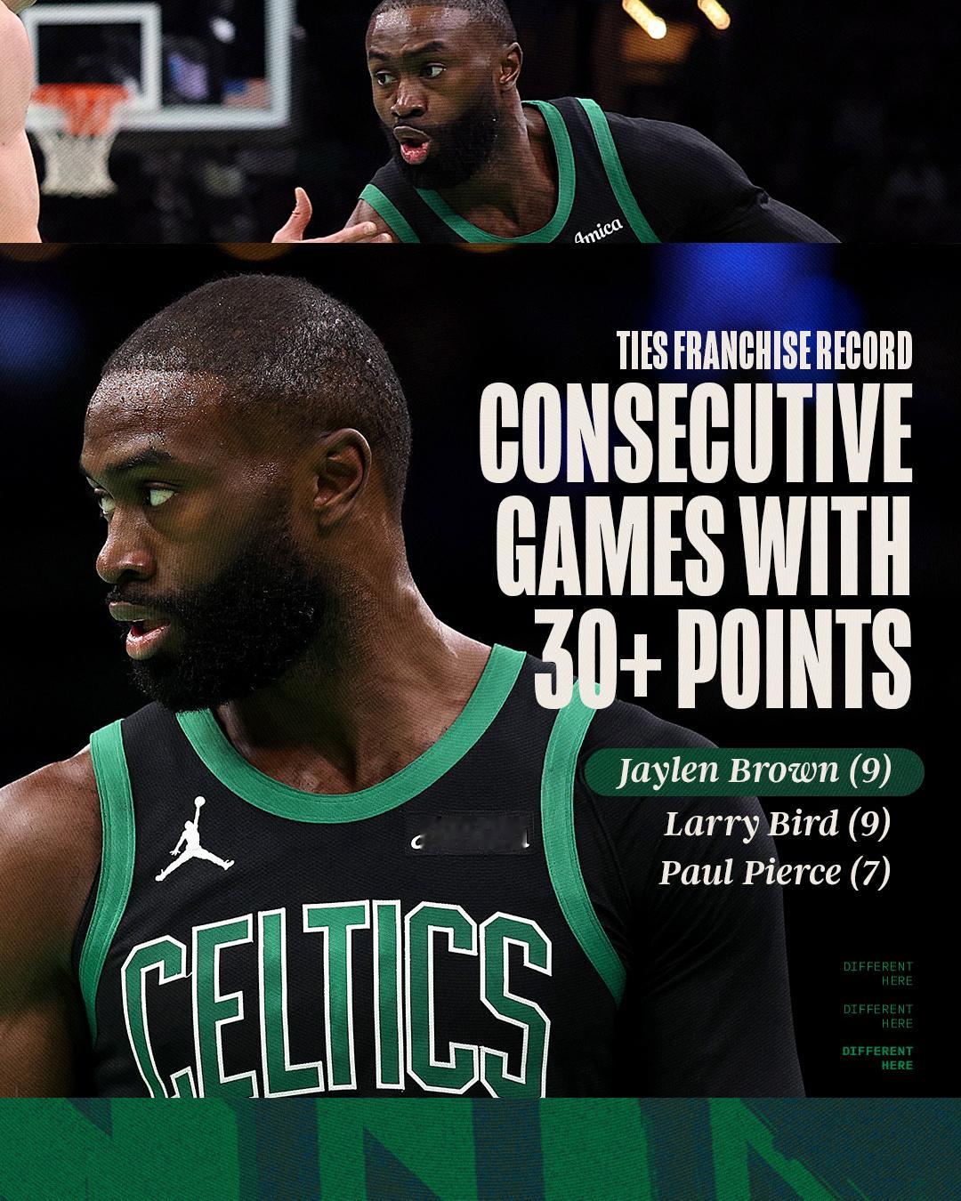 杰伦布朗空砍37分7篮板4助攻,连续9场比赛砍下30+,追平拉里伯德保持的队史纪录;连续9场30+凯尔特人战绩6胜3负 开拓者终结凯尔特人四连胜波士顿凯尔特人