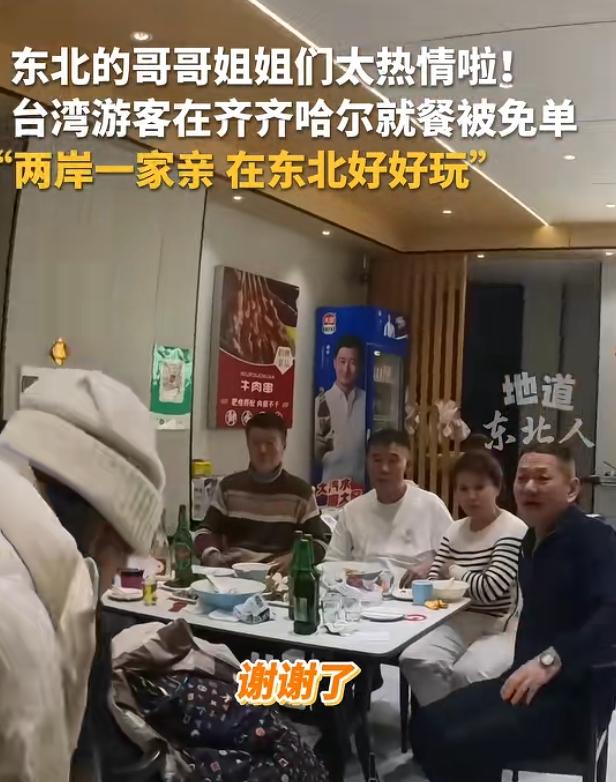 格局打开了!两名台湾女生到齐齐哈尔旅游,在餐厅吃晚饭准备买单时,却被老板告知:你们这桌都算完了!她们这才知道,原来单子被邻桌几位大哥大姐给买了,在表达感谢时,一位大哥表示:两岸一家亲,回祖国,天天拥抱你们!   两个台湾姑娘来齐齐哈尔旅游,晚上找了家餐厅吃饭,吃饱喝足准备去结账的时候,老板却笑着跟她们说“不用付啦,你们这桌的单,邻桌的几位大哥大姐已经帮你们买过了”。   这突如其来的温暖,让两个姑娘又意外又感动,而这份善意里,藏着的正是两岸同胞最质朴的亲近感。   其实现在越来越多的台湾同胞愿意来大陆走走,不管是看风景还是尝美食,便捷的交通和宽松的政策,让两岸同胞见面越来越容易。   齐齐哈尔的烤肉本来就出名,吸引各地游客慕名而来,这两个台湾姑娘也是冲着这份特色来的,没想到不仅吃到了美食,还收获了一份跨海峡的温暖。   最难得的是,这不是什么刻意安排的活动,就是市井里最普通的一餐饭,陌生人之间的一次主动搭手,可恰恰是这种不刻意,才更显真诚,也更能打动人。   有网友说,大哥大姐这波操作太圈粉了,买单花的钱不多,但传递的善意重千斤,这就是咱们中国人刻在骨子里的热情。   还有台湾网友留言说,自己之前来大陆旅游也遇到过类似的温暖,陌生的善意总能让人瞬间放下顾虑,感觉就像在自己家一样。   更有人说,比起那些空洞的口号,这种实实在在的互动,才是拉近两岸距离最好的方式。   现在社会节奏快,陌生人之间大多是各走各的,很少有主动搭话帮忙的,而这几位大哥大姐主动给台湾同胞买单,不仅打破了陌生人之间的隔阂,更悄悄消弭了两岸之间的心理距离。   很多人总说两岸有距离,但其实距离从来不是地理上的,而是心理上的,这样一次小小的善意,就把这份心理距离拉近了一大步,让“两岸一家亲”不再是嘴上说说,而是真真切切能感受到的温暖。   两岸交流,民间的互动远比官方的喊话管用,两岸同胞本来就是同根同源的一家人,有着一样的文化、一样的习俗,这份血脉亲情是割不断的。   官方层面的交流再频繁,不如民间一次真诚的相遇;宣传口号喊得再响亮,不如陌生人递过来的一份温暖。   这几位大哥大姐的举动,就是最好的“民间外交”,不用讲大道理,只用一个简单的买单动作,就让台湾同胞感受到了大陆的善意,这种感染力,是任何宣传都比不了的。   大哥大姐买单的时候,肯定没想过要出名,也没想要什么回报,就是觉得“都是中国人,出门在外帮衬一把是应该的”,这份不带任何功利心的亲近感,才是最能直抵人心的。   这也给我们提了个醒,两岸同胞之间根本没有那么多隔阂,所谓的距离,很多时候都是被外界的杂音放大的,只要多一些这样真诚的互动,就能慢慢消除误解,凝聚起一家人的共识。   不知道大家有没有遇到过类似的温暖瞬间,你对这种两岸民间的善意互动有什么看法? 信息来源:黑龙江日报·地道东北人