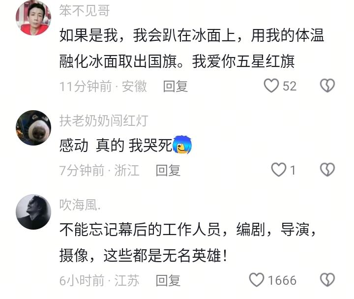 看到国旗落水里不该打捞吗? 近期新疆民警凿冰打捞红旗一事备受关注,零下10度的天气,连手套都没戴,就这么徒手凿开冰层,在冰冷的河水中把红旗打捞了上来。 爱护国旗人人有责,这么让人感动的事,却有些人在阴阳怪气,而且这股风气越演越烈,比如“不该用冰凿在国旗上破冰”、比如质疑“提前放好摄影机拍摄”、还有人怀疑是“剧本”等等。 那么厚的冰,不用工具破冰怎么搞?再说民警从发现国旗、准备工具等等过程,肯定引人关注,就会有不少人拍摄,再加上有执法记录仪等等,打捞国旗这么有意义的事,不该记录一下吗?再说这种事有必要演吗? 想知道那些阴阳怪气的人,贬低自己的好处在哪?