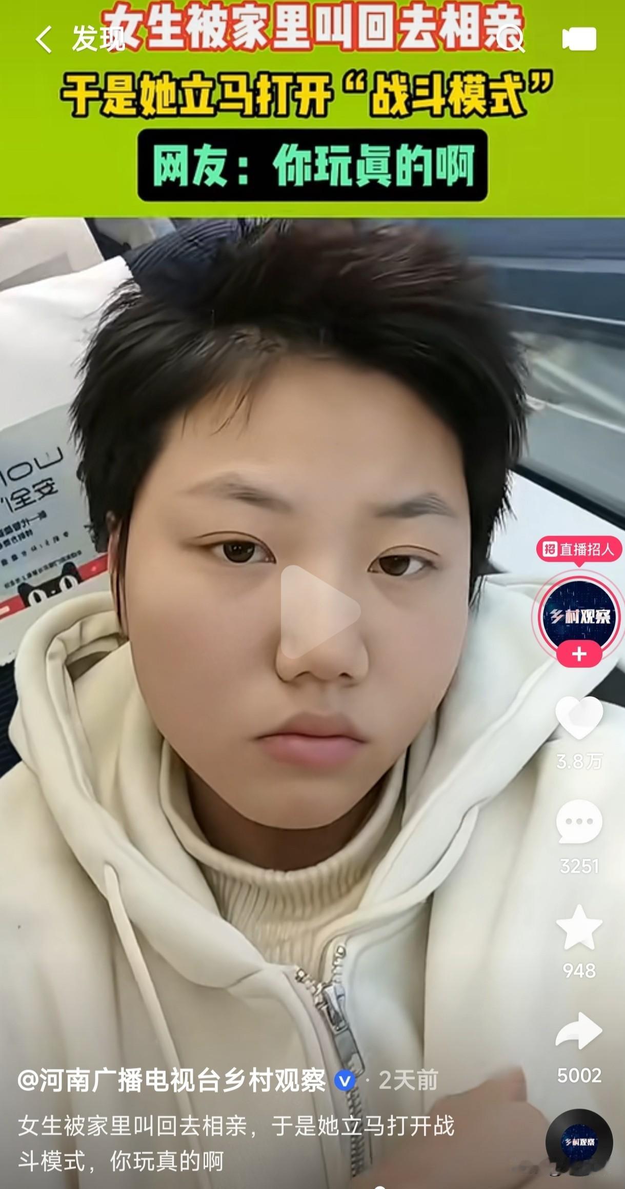 女生被家里叫回去相亲,于是她立马开启战斗模式,从长发飘飘的仙女秒变短发精神小伙,她这是不愿意听从家里安排的相亲才出此下策吗? 这女子为了不听从父母的摆布也是真敢下狠手,在毁长发和毁一生之间,她最终选择了毁掉长发,长发可以在长,但人生永远都不可能会回到以前,她从淑女形象秒变邋遢小伙这是为了不让相亲对象看上她吗?或者是她已经有了心仪的对象,但父母这关必须要面对,为了不让父母难看,不让相亲对象看上她,她只能在自己身上牺牲了不是吗? 在婚姻大事上到底是听从父母的安排结婚生子,还是遵循自己内心的想法去生活,各有各的活法,结婚生子就能幸福一生吗?不结婚生子难道就不会幸福吗?