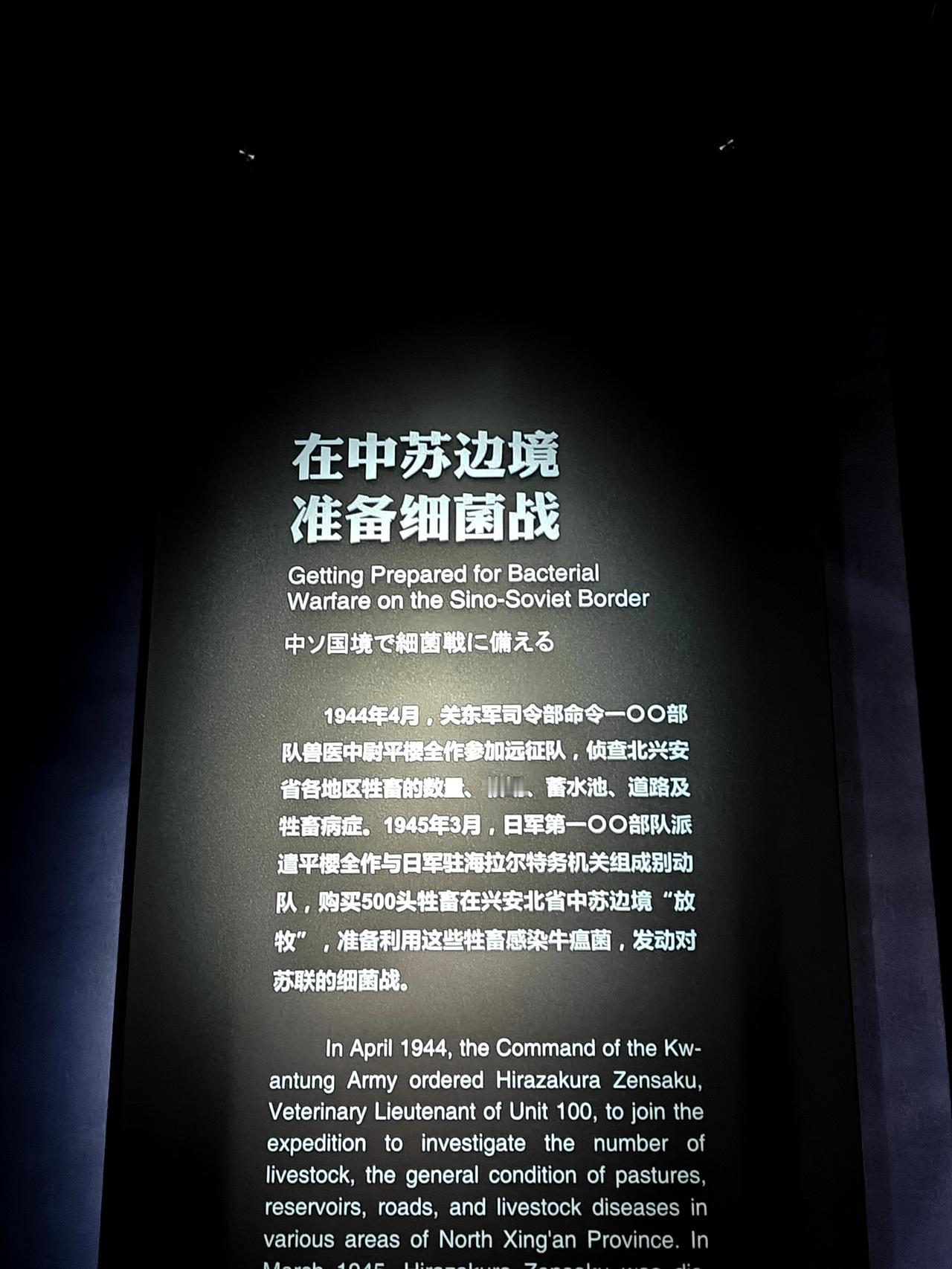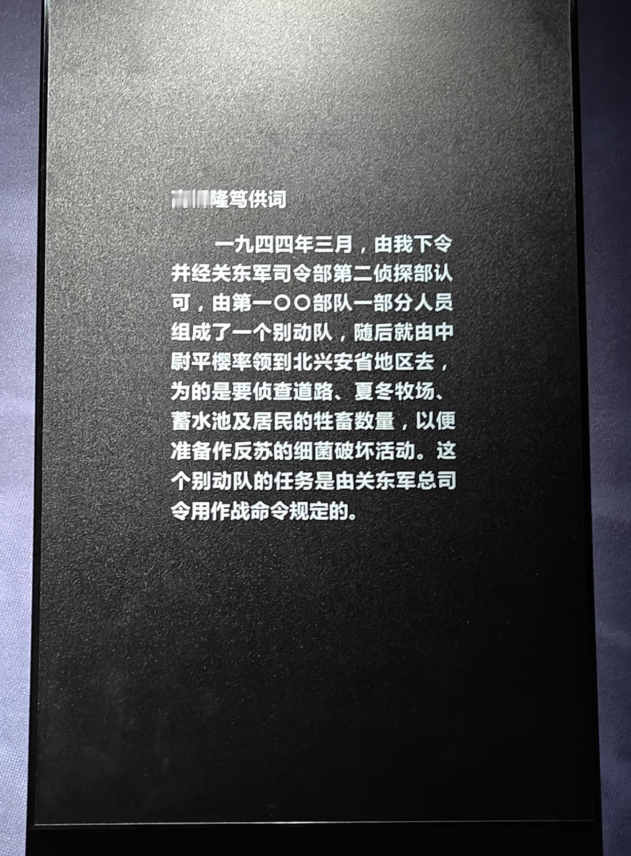 1945年8月日本战败投降前夕,长春的第100部队跟在哈尔滨的731部队一样,销毁了本部的建筑设施、实验品和档案等罪证,以掩盖细菌战罪行,其部队成员也是大部分有组织地撤回到了日本国内,没有受到审判。但也有少部分人员被苏联俘虏并押解到其远东地区,之后在伯力进行了审判。 100部队成员高桥隆笃(日本陆军兽医学校教官出身)在审判中供称:1944年3月,由他下令并经关东军司令部第二侦探部认可,由100部队一部分人员组成了一个别动队,由该部队兽医中尉平樱全作率领到兴安北省地区,先侦查道路、夏冬牧场、蓄水池,以及居民的牲畜数量和牲畜病症,以便准备作反苏的细菌破坏活动。这个别动队的任务是由关东军总司令用作战命令规定的。 之后在1945年3月,第100部队派遣平樱全作别动队与关东军驻海拉尔特务机关协作,购买了500头牲畜在兴安北省中苏边境进行“放牧”,准备利用这些牲畜感染牛瘟菌,发动对苏联的细菌战。那个执行具体任务的平樱全作也被苏军俘虏,在伯力接受了审判,在陈列馆中多次出现他的照片(图4),都是低着头,似乎有些局促不安和紧张。不知道他这种姿态是对自己的所作所为感到愧疚呢,还是只是对自己的前途命运感到担忧,他想的应该是后者,愧疚恐怕并不存在!