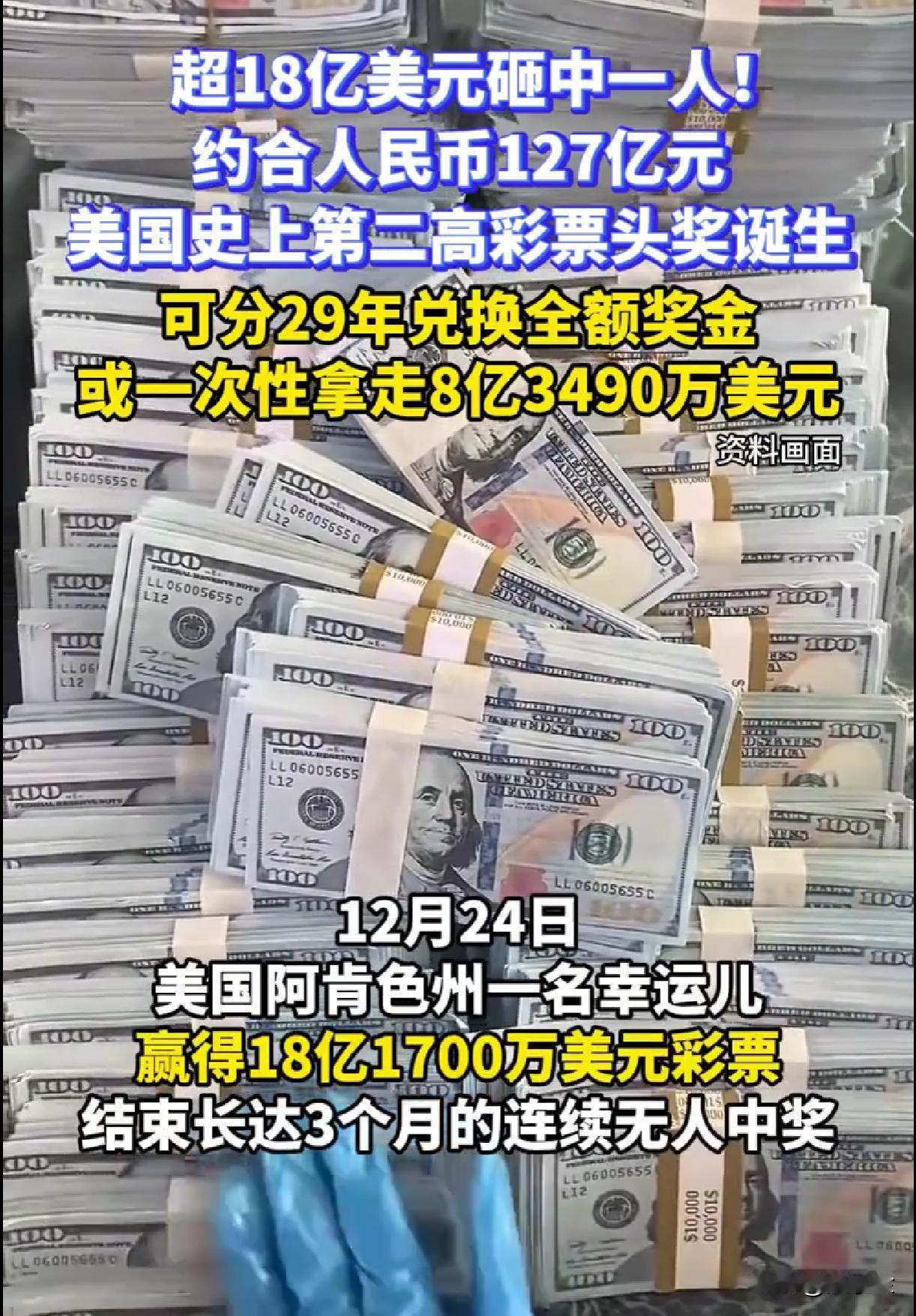 美国彩票大奖牛了!超过18亿美金中奖金额一人中的!堪称是美国历史上第二个大奖! 厉害了,中的这奖金估计一下子成了亿万富翁!据说美国史上第一头奖是127亿美金! 不知道他们中奖要不要蒙面或者穿个玩偶服! 他们的规则也很奇葩,这个头奖是一下子清空了奖池!而在之前,长达3个月的连续无人中奖!