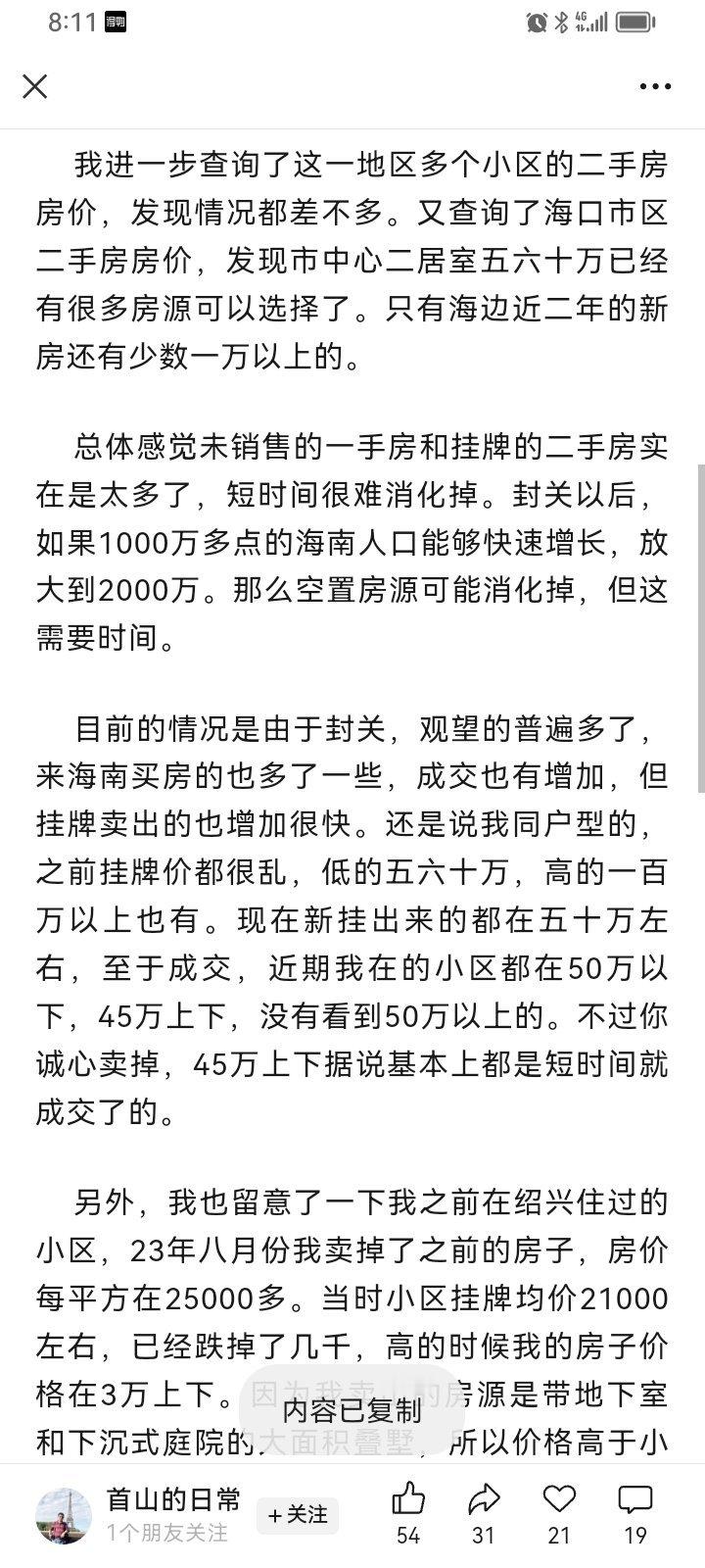 【房市和股市一样,套牢盘没有卖掉以前都不会涨,都要放量才有可能消化套牢盘】总体感觉未销售的一手房和挂牌的二手房实在是太多了,短时间很难消化掉。封关以后,如果1000万多点的海南人口能够快速增长,放大到2000万。那么空置房源可能消化掉,但这需要时间。