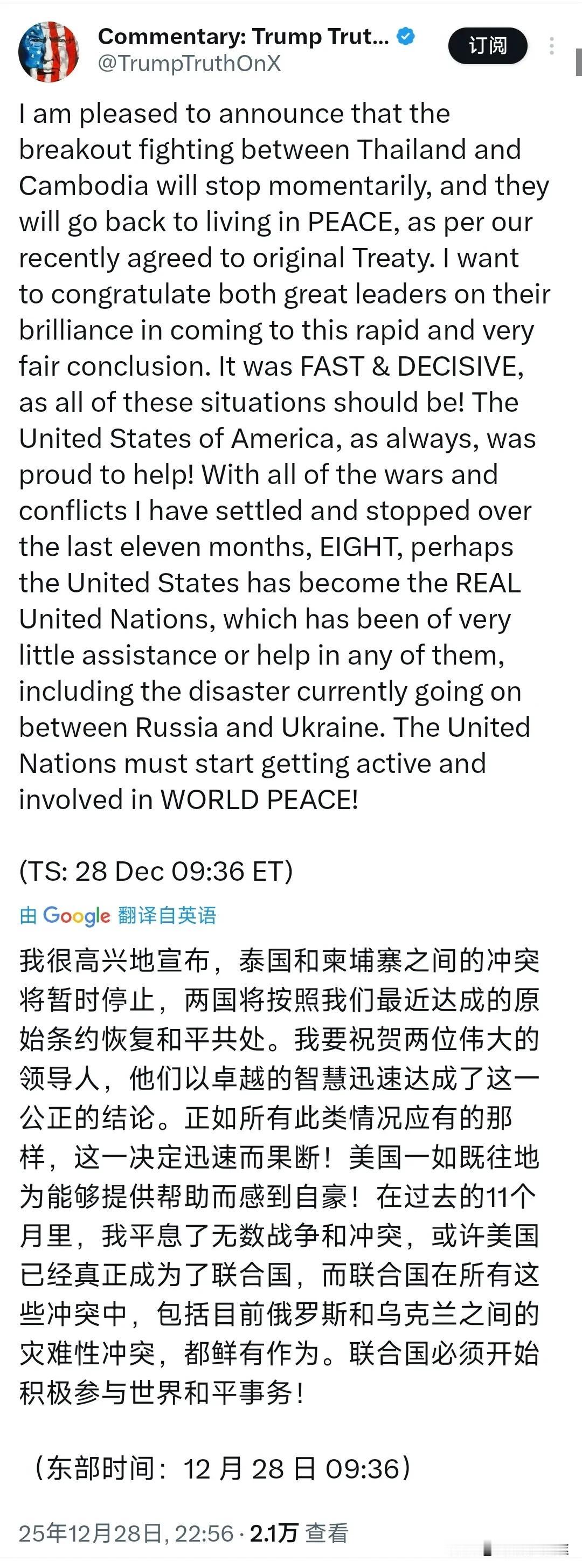 【有看过不要脸的,但没看过美国这么不要脸的】抢功 邀功 自诩:泰柬停火是美国的功劳! 12 月 28 日特朗普跳出来表示: 我很高兴地宣布,泰国和柬埔寨之间的冲突将暂时停止,两国将按照我们最近达成的原始条约恢复和平共处。我要祝贺两位伟大的领导人,他们以卓越的智慧迅速达成了这一公正的结论。正如所有此类情况应有的那样,这一决定迅速而果断!美国一如既往地为能够提供帮助而感到自豪!在过去的11个月里,我平息了无数战争和冲突,或许美国已经成为了‘真正的联合国’,而联合国在所有这些冲突中,包括目前俄罗斯和乌克兰之间的灾难性冲突,都鲜有作为。联合国必须开始积极参与世界和平事务!” 这是美国卢比奥率先捞功之后 特朗普再次表明泰柬停火是美国的功劳。不过特朗普的“表演秀”是一贯不要脸的自吹自擂的表演。10 月 27 日,在美国特朗普的施压之下,泰柬仓促的签下了《吉隆坡和平协议》,就连泰国外长都表示:正是因为 为了给特朗普的面子 配合特朗普的东盟峰会之行而签下了这种毫无意义 毫无正确的协议 ,才导致 12 月 7 日泰柬重燃战火。 而正是在中国的努力调整之下,才有了 12 月 27 日的最终停火并签下了双方的协议。而不论是泰国或是柬埔寨事后都对中国的正义 不偏袒的立场表示感谢与敬佩! 相反美国做了什么呢?按泰国官员的话表述:正是因为美国偏袒柬埔寨 而导致了双方边界问题不能公平公正的处理 美国不是要调停 而是在为了美国的利益将双方的边界问题更加的复杂化,无益于双方问题的解决! 而如今美国还在自诩“劳苦功高”,还以为美国力量可以替代联合国。一个连联合国会费都想抵赖的国家,还以为自己可以替代联合国的力量,真是太可笑了,只能说真的太不要脸了! 这个世界上的任何冲突,大部份都是美国直接或间间干抑造成的,而美国还以“公平 公正”自居,美国何来的信心与能量呢?