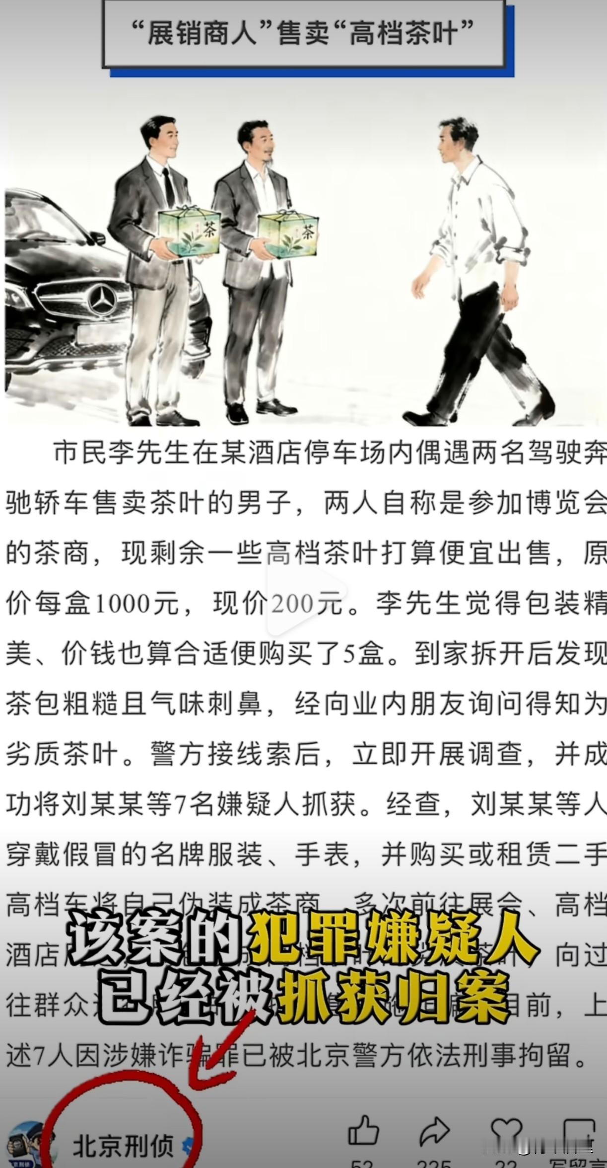 最近,《今日说法》主持人李晓东在停车场遇到了“豪车卖茶”骗局。 骗子将自己包装成参加博览会的茶商,原本1000块钱的茶叶还剩一点,想200块钱出手。 李晓东觉得包装精美,价格也合适,就一口气买了5盒,到家打开后傻眼了,茶包粗糙且味道刺鼻,咨询好友之后发现被骗,随即报警。 警察经过调查也是成功抓获了7名嫌疑人。 不得不说,现在骗子的骗术真是太高明,连天天讲案例、普法律的主持人都会上当,更别提普通老百姓了。 年底了,各种小偷小摸和骗子又开始活跃起来冲业绩了。一定要审慎判断,提高警惕,捂紧自己的腰包 毕竟,辛辛苦苦累了一大年,钱都不是大风刮来的。多一分小心,少一次被骗。