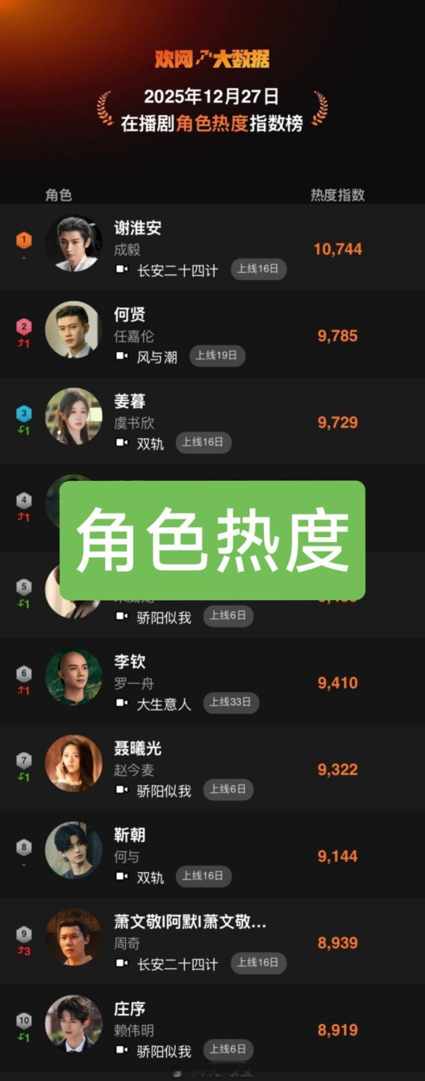 除了➕广,欢网大数据在播剧角色热度指数:成毅长安二十四计谢淮安, 连续12日破万登顶!都破防吧。
