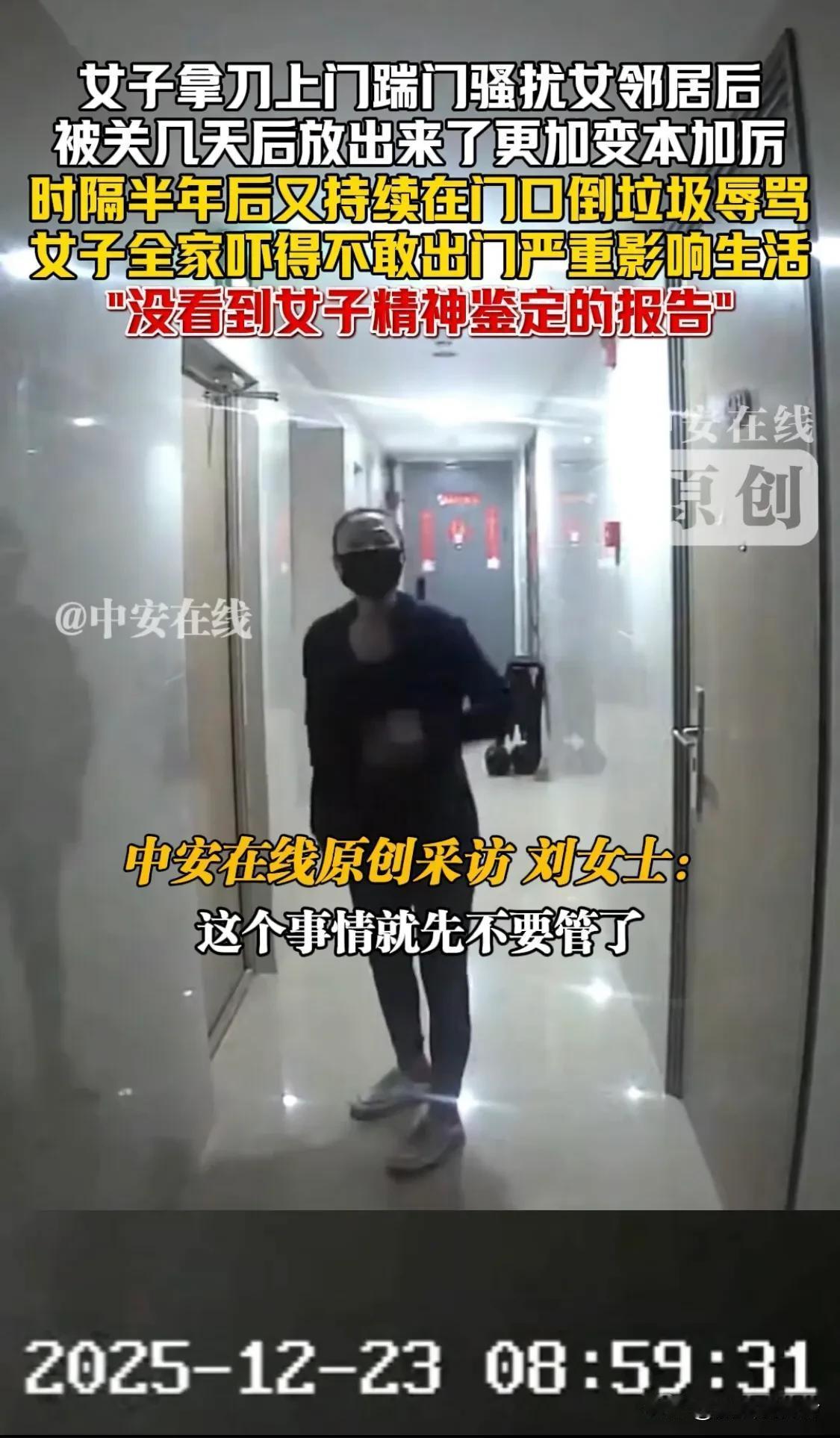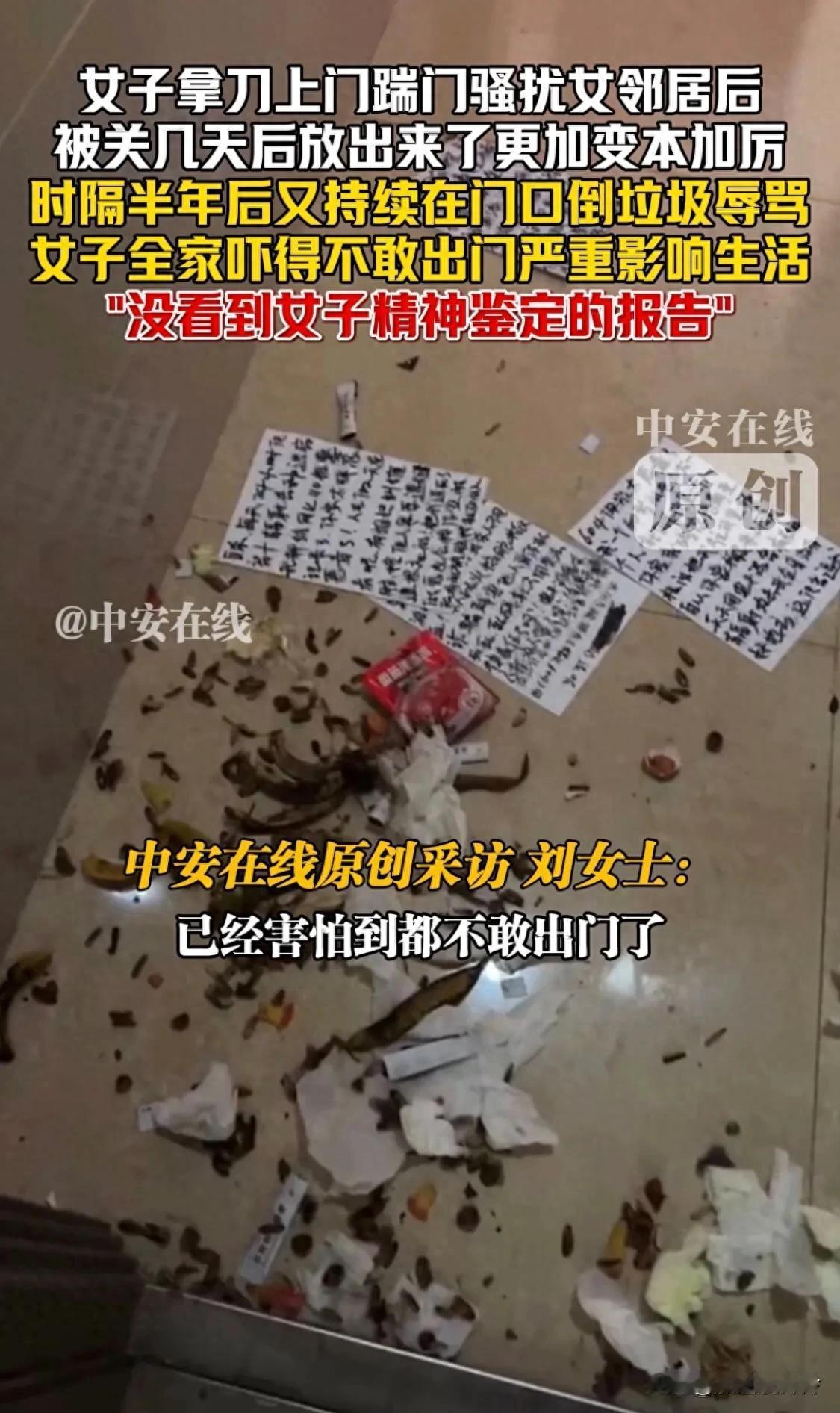 买套房子,买来个"恶邻",这日子还能过吗? 辽宁刘女士花钱买了套二手房,本想着开开心心搬新家,谁知道噩梦才刚刚开始! 刚住进去没几天,楼下一个阿姨就在业主群里对她破口大骂。更离谱的是,她家门口隔三差五就莫名其妙出现一堆厨余垃圾,臭气熏天。 刘女士一开始还想着好好沟通,毕竟低头不见抬头见嘛。可人家压根不搭理,骚扰就这么持续了大半年! 后来刘女士才知道,原来上一任房主就是被这阿姨给"逼走"的,难怪房子卖那么便宜。这不就是个坑吗? 更可怕的还在后头。今年五月,这位阿姨直接提着刀上门砍门、踹门,站门口就是一顿骂。刘女士吓得报警,阿姨被拘留了。 本以为能消停了吧?没想到人家出来后变本加厉,继续在门口倒垃圾辱骂,刘女士一家现在吓得都不敢出门了! 这阿姨自己说是因为"楼上整宿整宿不让人睡觉"。可问题是,都换了两任房主了,她都觉得吵,这到底是谁的问题? 刘女士说:"我没看到她的精神鉴定报告!" 民警也很无奈,邻里纠纷确实难处理,只能劝刘女士别跟她正面冲突。 网友们吵翻了:有人说刘女士太软弱,"人就是欺软怕硬的";也有人说法律对这种人束手无策,难道只能忍着? 说真的,遇到这种邻居,你们觉得该怎么办?是硬气点还是忍一忍?评论区聊聊!