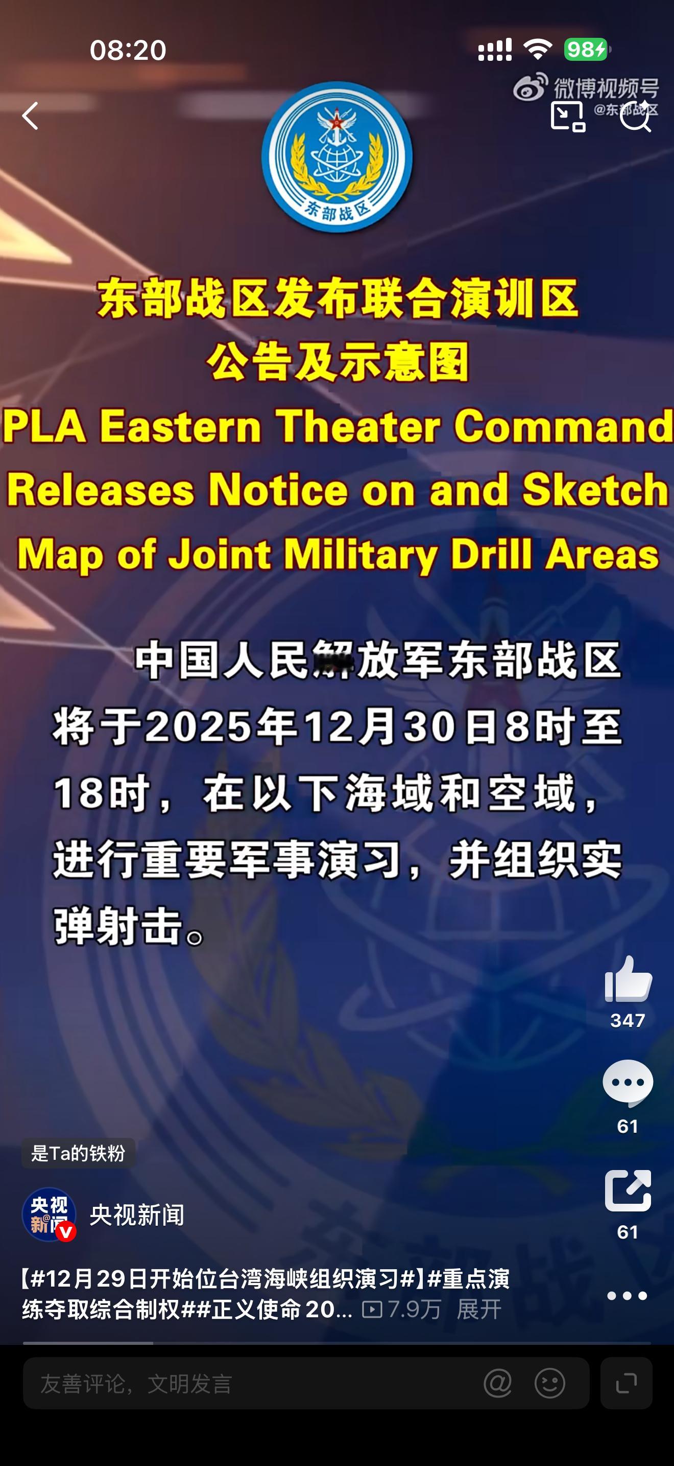 东部战区发布联合演训区示意图嗯,没说演习到什么时候,只说了我们演习,距离湾湾陆地大概30km,真近啊,感觉可以瞬间登岛了,开心 深圳