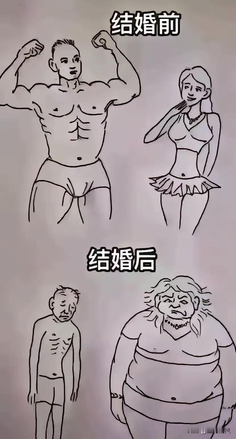 婚姻是把杀猪刀 刀刀都往肉上削 结婚前那叫一个猛男靓女 小伙一身腱子肉 肌肉块练得棱角分明 姑娘身姿窈窕 眉眼间尽是风情万情 结婚后直接来了个惊天逆转 小伙瘦得皮包骨头 往日的八块腹肌早没了踪影 活像被抽了精气神的蔫黄瓜 姑娘倒是“发福”得膀大腰圆 昔日的窈窕身段变成了浑圆的“米其林” 俩人站一块儿 简直是判若两人 婚姻是什么 婚姻是将猛男美女变成麻杆壮汉 婚姻就是互换人生 图源网络 若侵即删