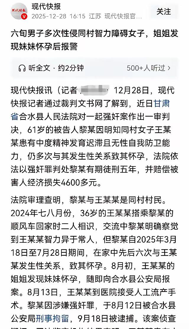 甘肃,61岁男子意外发现同村36岁女子智力有问题,心生歹念,4个月内,男子6次将女子哄骗至家中,之后,女子姐姐见她小腹渐渐隆起,怒而报警。法院的判决让人意外! 2025年夏天,甘肃合水县一个村庄里,36岁的王某某(化名)像往常一样纯真地生活着。她患有中度精神发育迟滞,心智如同孩童,却没想到这份不设防的善良,成了同村61岁黎某眼中的“可乘之机”。 黎某在交谈中敏锐察觉王某某的智力异于常人,却并未生出同情,反而动了邪念。从2025年3月起,他先后六次将王某某哄骗至家中实施侵 犯。王某某的世界里没有男女的概念,更不懂何为反抗,只是隐约觉得“黎大爷的行为让她不舒服”。 8月初王某某的姐姐发现妹妹的肚子微微隆起,嗜睡和呕吐的症状越来越明显。她带妹妹到医院检查,结果怀孕了。在姐姐的追问下才从妹妹零碎的语言中拼凑出真相,姐姐拨通了报警电话,揭开了这场隐藏的罪恶。 8月12日,黎某被警方刑事拘留;8月13日,王某某接受人工流产手术。司法鉴定显示,王某某无性自我防卫能力,无论她是否“同意”,黎某的行为均构成强奸。庭审中,黎某虽认罪认罚,但其辩护人仍试图质疑“是否违背妇女意志”。法院最终认定,黎某利用弱势群体实施犯罪,性质恶劣,判处有期徒刑五年,赔偿经济损失4600余元。 五年刑期抚不平受害者一生的创伤,4600元赔偿更是弥补不了一个家庭的痛苦。早在2017年,甘肃古浪县一名村支书就曾性 侵未满14周岁的智障幼女,被判刑9年。 法律惩戒固然重要,但社区关注、家庭监护与社会帮扶的联动更为关键。每一个“王某某”都不应成为沉默的羔羊,她们的尊严需要制度与良知共同守护。 各位读者你们怎么看?欢迎在评论区讨论。