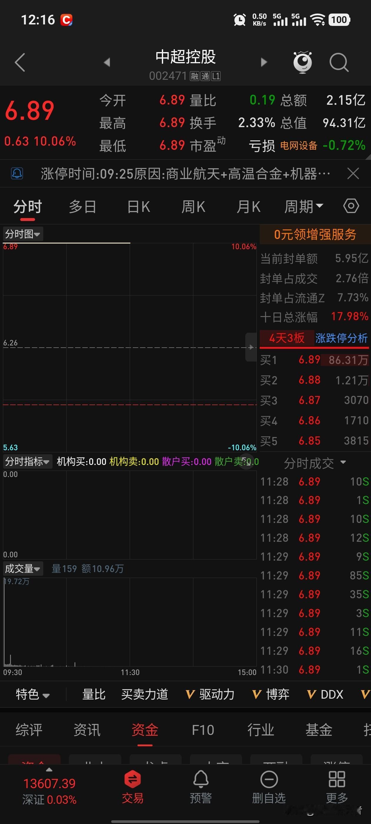 12月29日上午收盘,中超直接封板,继续上攻。 航天电子早盘低开,资金流出。10点开始拉升,反反复复。今天出在低点,没赚几个子。高位股有风险。商业航天板块的低位股开始发力。涨停有14支,跌停3支。机会还是很多,就看选择了。航空航天板块 航天概念股 今日A股