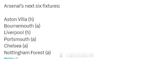 阿森纳 未来6场比赛:主战维拉、客战伯恩茅斯、主战利物浦、客战朴茨茅斯、客战切尔西、客战诺丁汉森林。