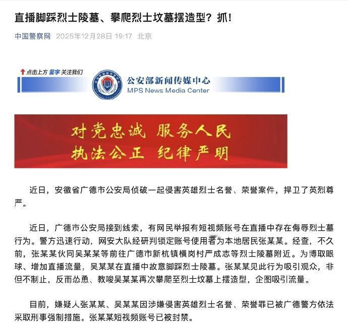 【安徽广德2人直播时故意脚踩烈士陵墓被抓】直播时故意脚踩烈士陵墓账号被封 张某某伙同吴某某等前往广德市新杭镇横岗村严成志等烈士陵墓附近。为博取眼球、增加直播流量,吴某某在直播中故意脚踩烈士陵墓。张某某见此行为吸引观众,非但不制止,反而怂恿、教唆吴某某再次攀爬至烈士坟墓上摆造型,企图吸引流量。目前,嫌疑人张某某、吴某某因涉嫌侵害英雄烈士名誉、荣誉罪已被广德警方依法采取刑事强制措施。张某某短视频账号已被封禁。(中国警察网)