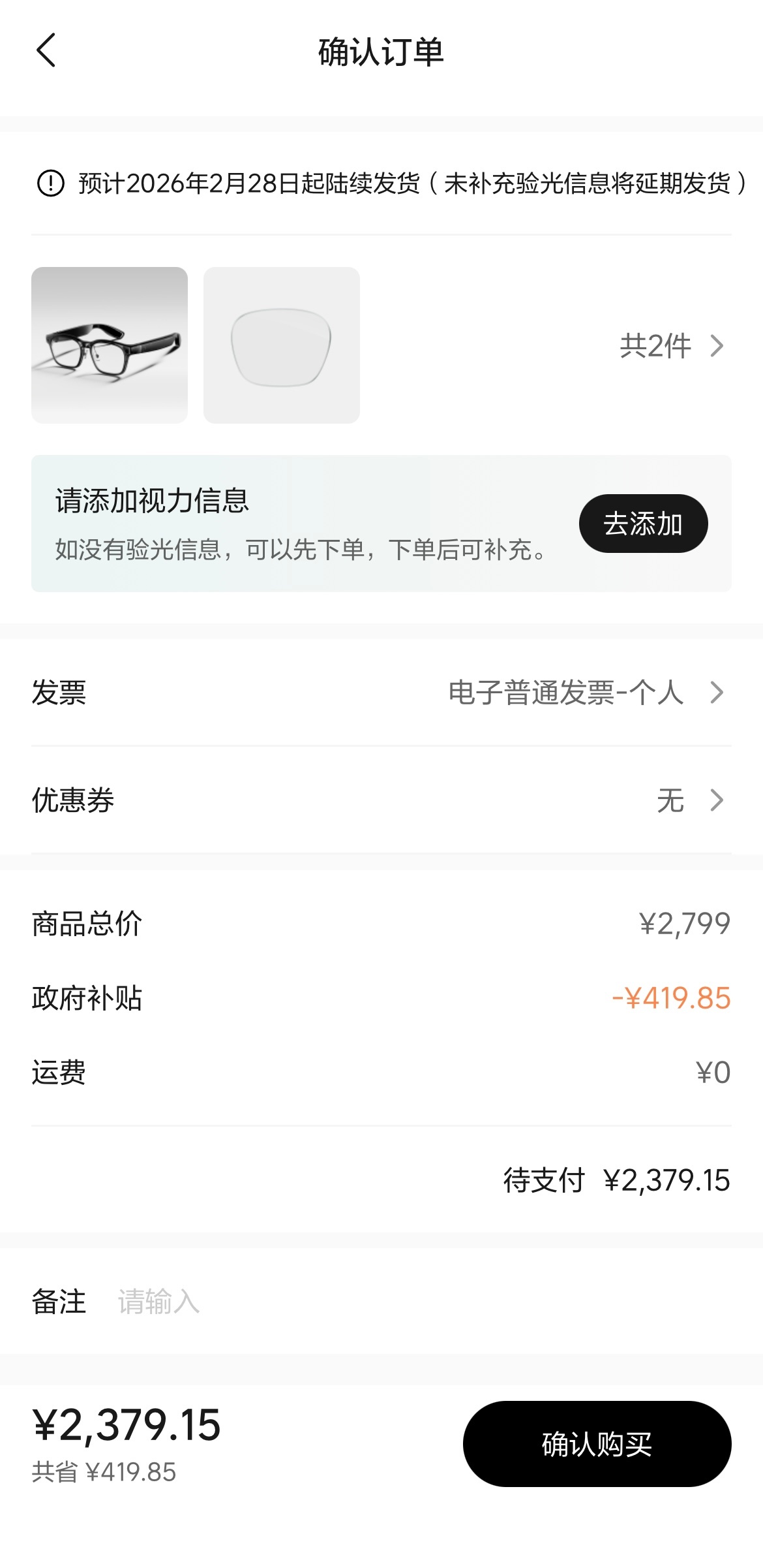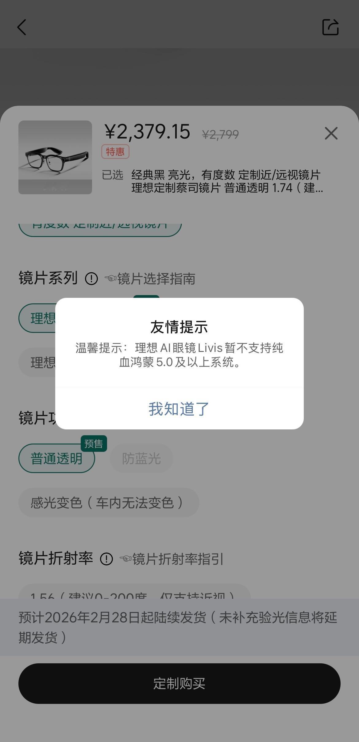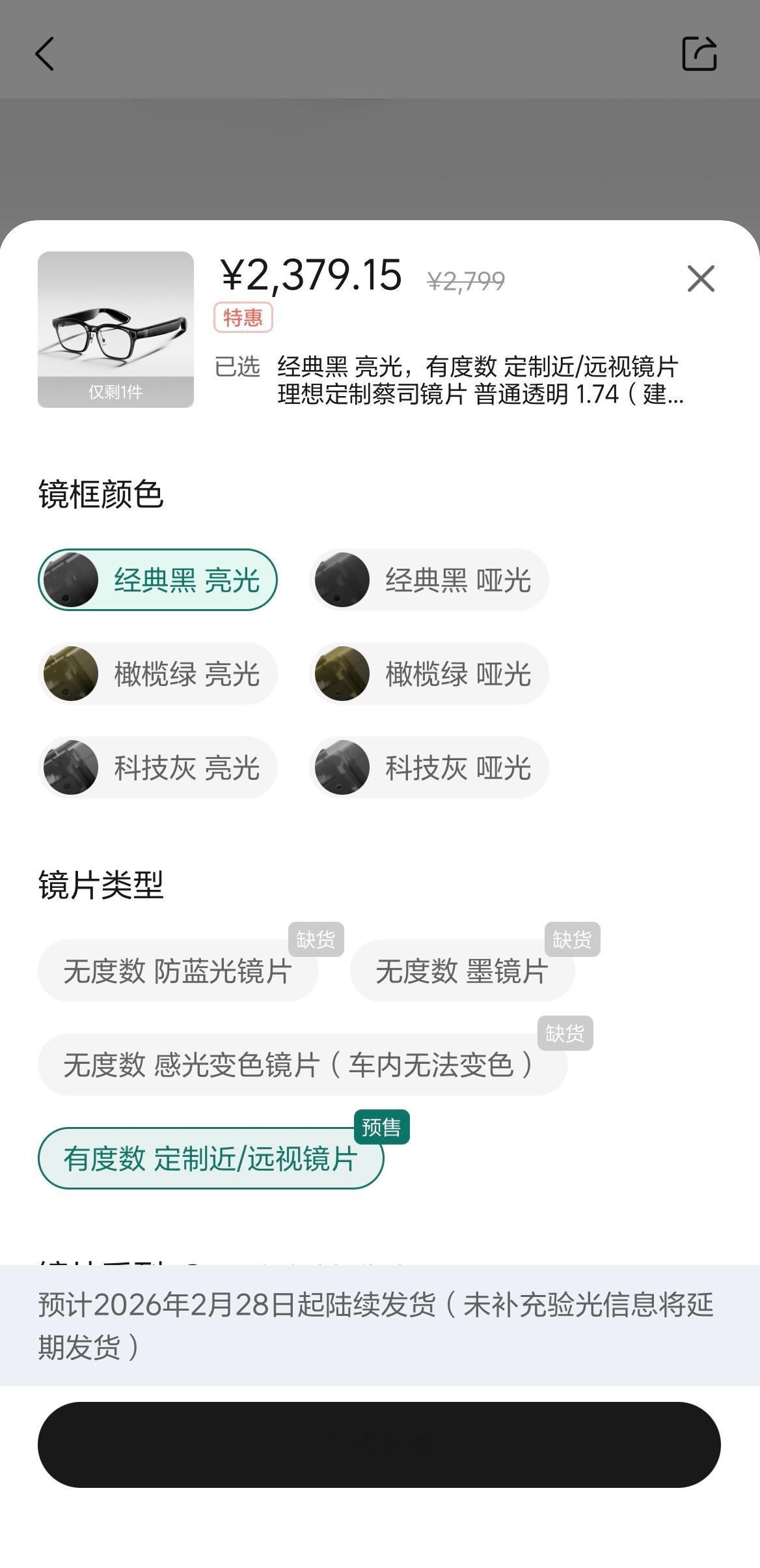 理想眼镜补货了,目前只有亮黑色可下单,2月底发货,估计数量有限,不信你看,我发完微博,肯定很快就没货了。