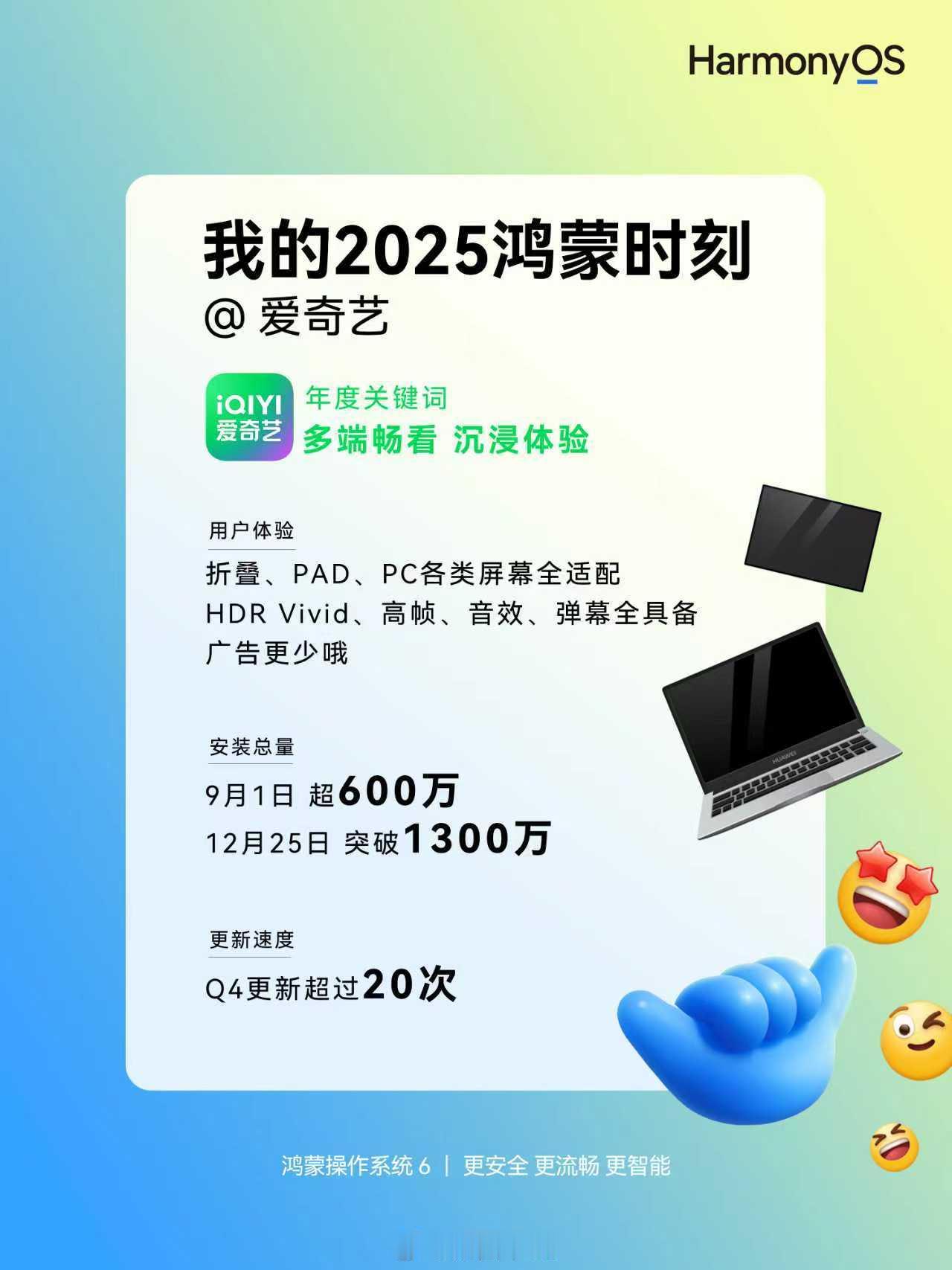 多款app晒鸿蒙年度成绩单12月29日的鸿蒙生态伙伴年度适配总结海报,呈现了芒果TV、爱奇艺等应用的适配成果。作为一个经常出差的人,鸿蒙在出行场景下的整合真的让我大开眼界。航旅纵横的行程卡片、百度网盘的资料随时取用,这些功能在手机和平板之间无缝切换,极大提升了我的工作效率和旅途舒适度。12月20日的《鸿蒙星光盛典》,也生动展现了鸿蒙生态的便捷体验。生态伙伴们的密集更新,为我们的旅途增添了不少小确幸。系统流畅,应用齐全,有35万+应用和元服务,这大概就是“好用”最朴素的解释了吧。听说现在日均新增15万+的设备,看来越来越多的人开始体会到这种便捷了,真的很高兴看到这样的变化。鸿蒙生态年终总结