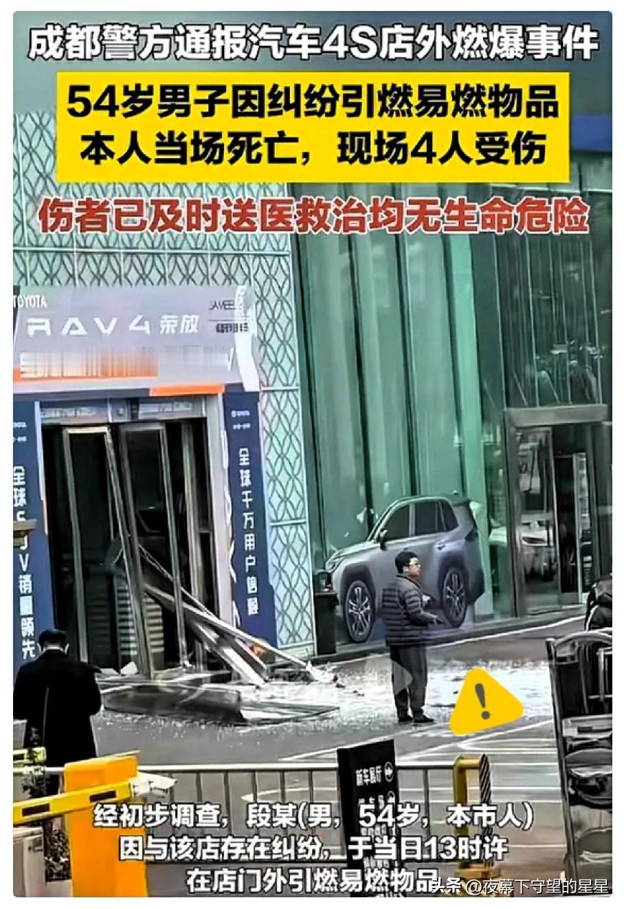 成都那个不退定金的一汽丰田4s店老板估计肠子都要悔青了吧,他的麻烦才刚开始: 哪怕当初痛痛快快退了呢? 现在好了,惹上个54岁的当事人段某,豁出命要在店外引爆。 这笔账算是彻底算砸了。 先不说四个伤者还在医院躺着,光是医药费和误工费就是个无底洞。 店面被震得严重受损,那些新车受损的钱谁来扛?还得重新装修。 最惨的是名声彻底烂了,大家都知道这家店“吃人不吐骨头”,以后谁还敢去? 据说死者家属还要起诉,这丧葬费网传可能也要老板承担(以调查结果为准)。 为了扣这2万定金,搭进去几百万甚至整个生意,这哪是做买卖,简直是给自己掘坑。 (法律小提示:“定金”单方违约不退,但商家若有诱导签约可向12315投诉) 麻烦看官老爷们右上角点击一下“关注”,既方便您进行讨论和分享,又能给您带来不一样的参与感,感谢您的支持!