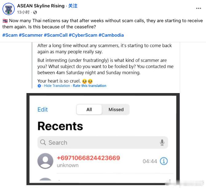 一些泰国人发出疑问,几个星期之后,他们又开始收到各种电诈电话。他们问,这是因为停火的原因吗?泰国对柬埔寨进行军事打击期间,电诈电话是消停的。