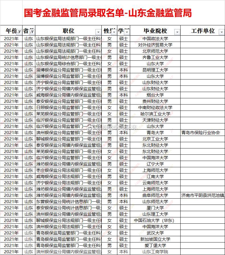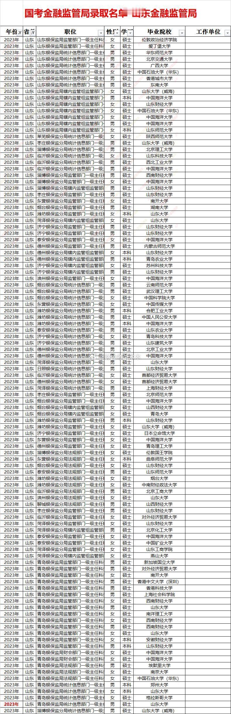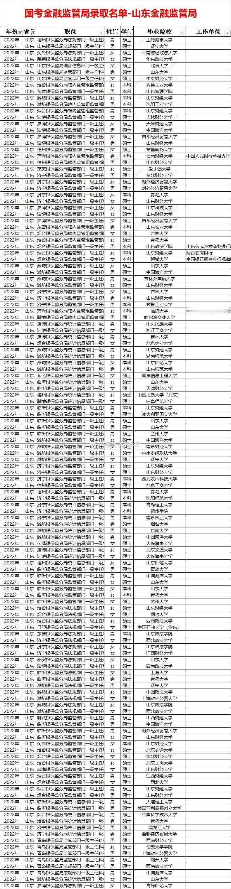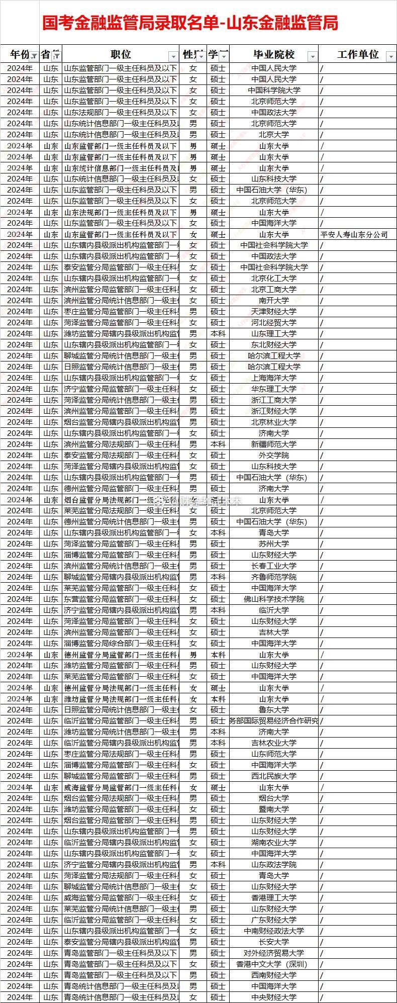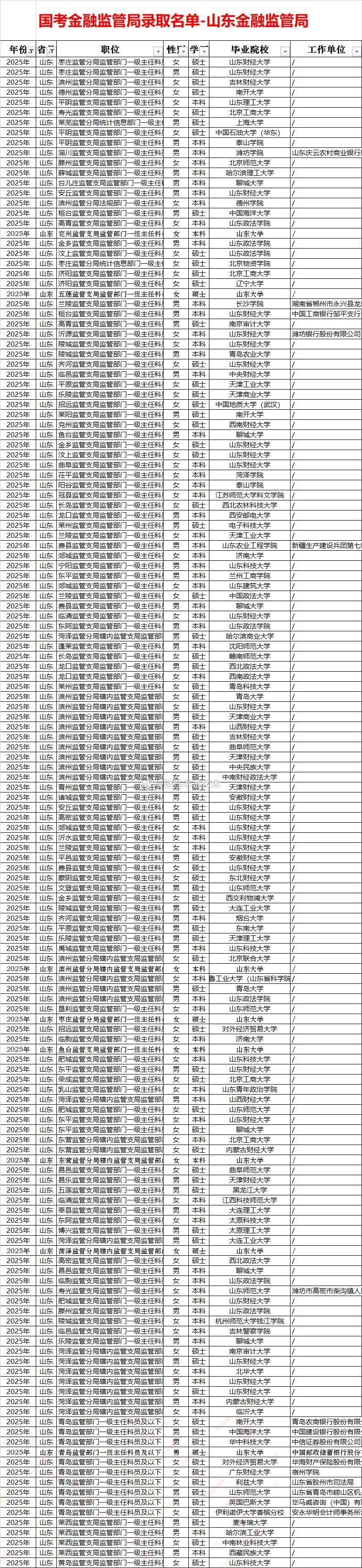 国考金管局山东录取名单解析 面试入围分数线一、规模与性别2025:录 82 人,男 39,女 432024:录 97 人,男 42,女 552023:录 95 人,男 46,女 492022:录 72 人,男 34,女 382021:录 47 人,男 24,女 23五年合计 393 人,女性占 53%。二、高校层次(可辨院校 329 人)“双一流”及以上 68%:人大、北师大、山大、南开、南大、武大、海大、港大、新国立、LSE 等。财经类名校 18%:对外经贸、中财、上财、西财、中南财、天财、浙财、山财。其他本科 14%。三、主要生源校山东大学、中国海洋大学、山东财经大学、中国石油大学(华东)、北京师范大学、对外经济贸易大学、南开大学、西南财经大学。四、工作单位(2024 有单位记录 6 人)平安人寿山东分公司、青岛市保险行业协会、济南市平阴县基层政府,其余未列,预计以“应届生无单位”为主。五、岗位分数线区间(2021-2025 全部地区最低-最高)财经岗:46.8-72.5,中枢 60→64,逐年抬升。财会岗:48.8-70.7,2023 后高位震荡。法律岗:47.4-69.7,2024 峰值 69.7。计算机岗:48.5-63.0,区间最窄,年均 52-56。综合岗:49.6-68.4,五年上扬 8 分。趋势:最低门槛普涨 4-6 分,热门分局峰值已破 70,计算机、综合岗涨幅最稳。