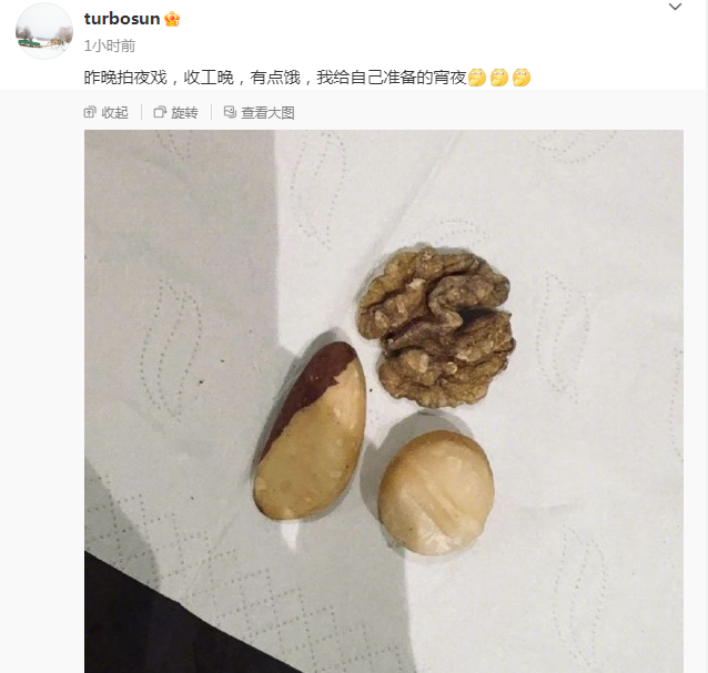 孙俪的3颗坚果,又引发一轮老生常谈。孙俪最近在拍夜戏,很辛苦,她晒出自己的宵夜—