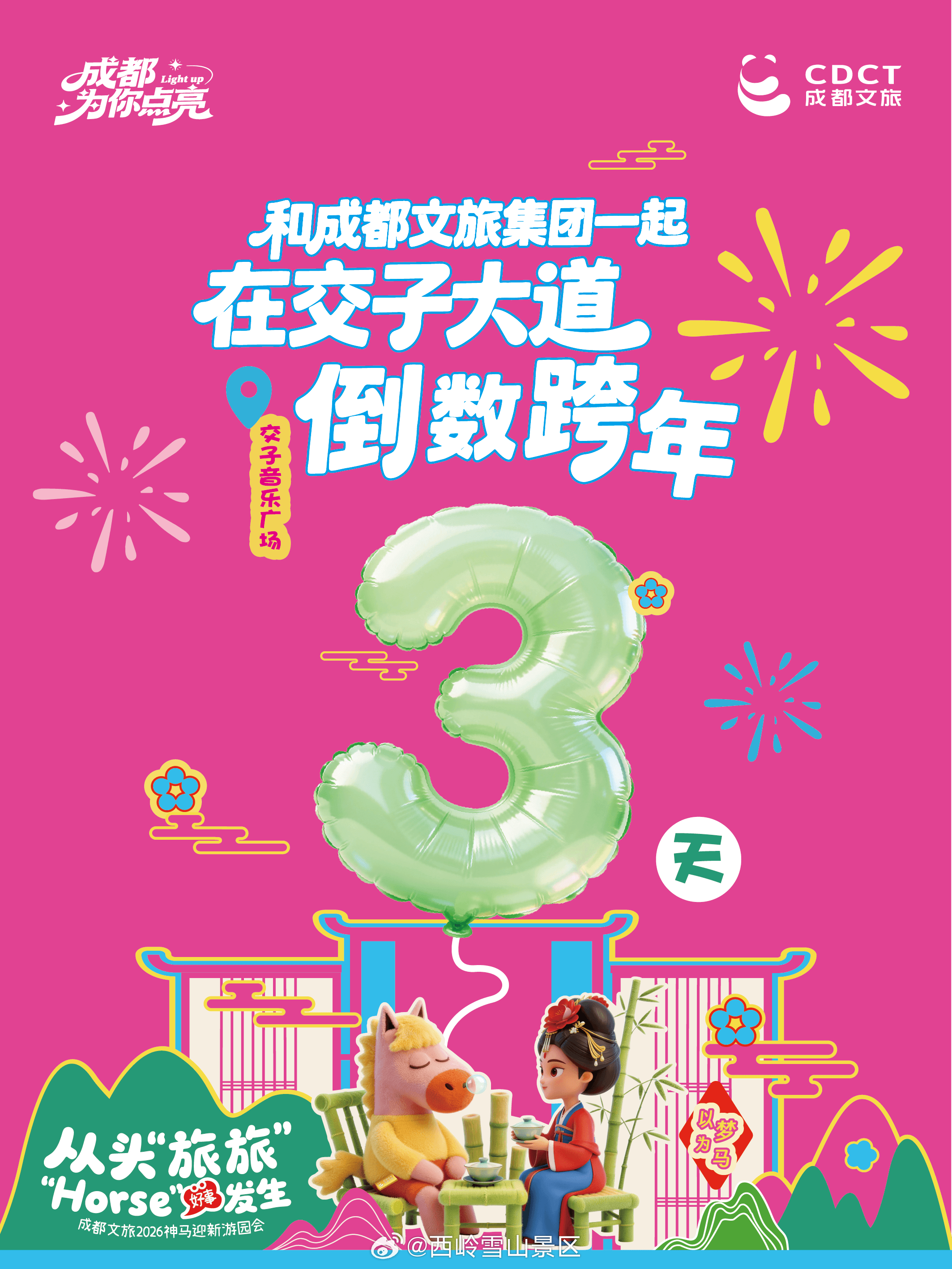 倒计时3天!“Horse”发生!神马来剧透📅 12月31日交子音乐广场,成都文旅集团邀你来跨年~❄️西岭雪山、宽窄巷子、夜游锦江、望江梦华·薛涛吟🚌文旅City Tour巴士、五凤溪·龙吟天城、成都文旅IP潮流空间、成都主场·街头篮球厂牌季…✨ 八大文旅场景化身打卡秘境,一步一景,皆是成都味儿🎤古今演艺贯穿全场,游戏探索惊喜层层~🧧 一场可玩可看可分享的沉浸之旅,等你策马而来!#成都 #成都跨年 #成都文旅迎新游园会 #成都跨年夜#跨年