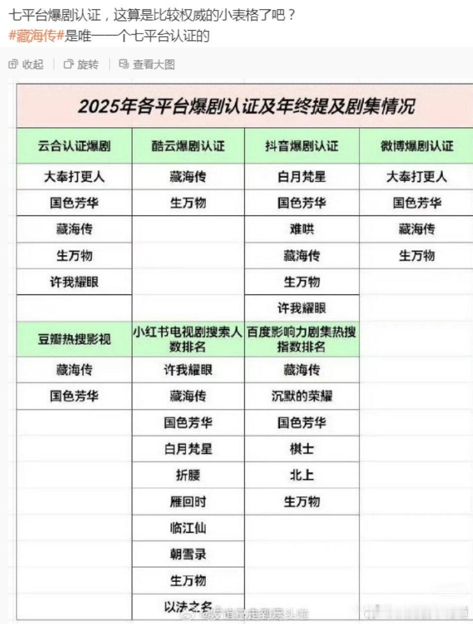 酷云爆剧认证的标准有两条在卫视播的剧很难达到,因为收视率折算为播放量,央视的数据要远远大于卫视,这也是为什么许我耀眼网播数据全年第一,也上不了酷云爆剧认证榜单的原因。另外,酷云爆款认证还对微博热搜数量有要求,这是去年承欢记为什么全端播放量多日破亿,讨论量也够的情况下,没能上榜酷云爆款剧集认证的原因,说白了就是热搜买少了。我怀疑微博给酷云投资了,不然为什么要这种标准。另外,不考虑上星频道的全端折算播放量标准有些耍流氓。