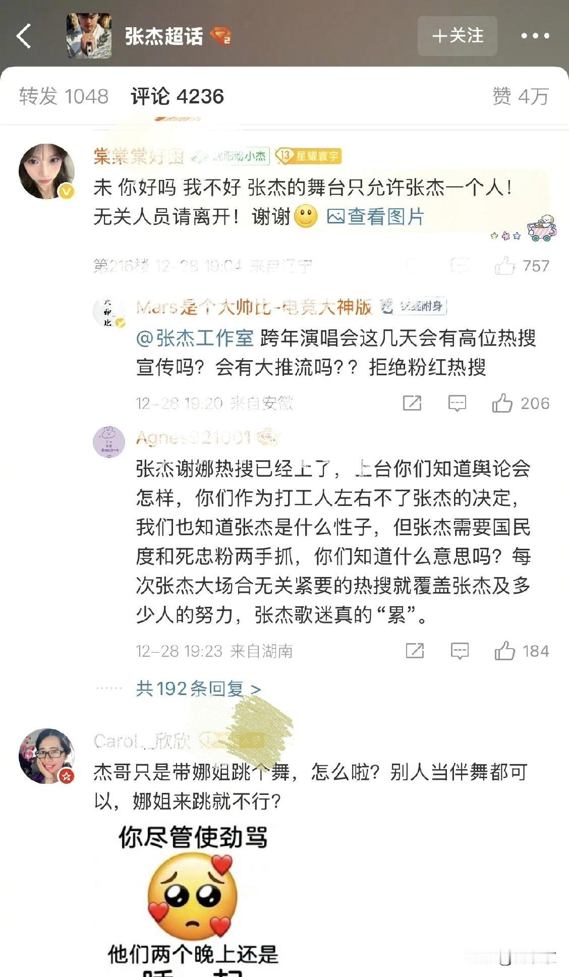 张杰谢娜跨年秀恩爱,粉丝破防现场:把她请下去!张杰这波跨年操作直接让部分粉丝破防了!明明夫妻合体跳双人舞是甜蜜暴击,可工作室评论区却翻车了,一堆人刷屏喊着:“只要张杰单人!无关人员快下台!” 这场景简直像偶像剧照进现实——正主在台上发糖,台下梦女粉却在疯狂拆CP。 人家合法夫妻同台表演,既专业又有爱,偏偏有人接受不了,非要幻想自己是女主角。 其实想想也挺逗,张杰谢娜都结婚这么多年了,每次同框还能引发这种争议。 说到底,明星的生活和舞台都是他们自己的选择。 粉丝可以表达喜好,但跑到官方场合喊话赶人就有点越界了。 追星的真谛是支持偶像的作品和选择,而不是按照自己的幻想来安排别人的生活。新年伊始,不如多些祝福少些苛求,毕竟偶像幸福快乐才是粉丝最该开心的事,对吧?