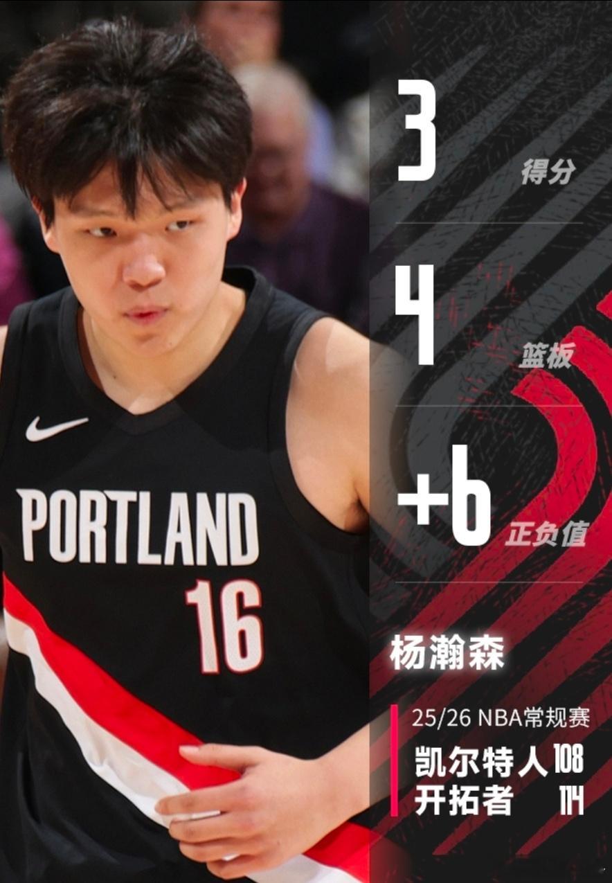 杨瀚森全场出战10分38秒,得到3分4篮板,正负值+6今日开拓者114-108击败凯尔特人。杨瀚森今日出战10分38秒,投篮3中1,其中三分2中1,得到3分4篮板,正负值则是+6全队第二。