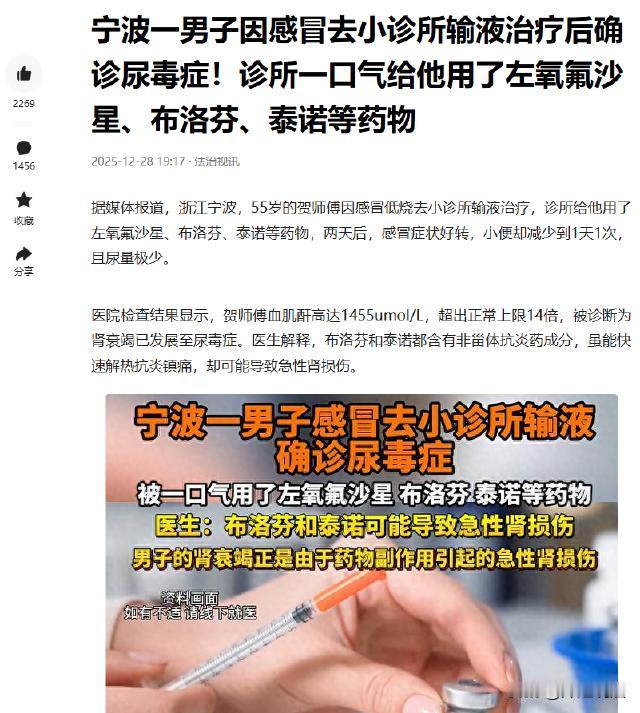 浙江宁波,55岁的贺师傅,因为感冒低烧,就去小诊所输液治疗,诊所给他用了左氧氟沙星、布洛芬、泰诺这些药。两天之后,贺师傅的感冒症状倒是好转了,可小便却出了问题,一天就排一次,而且尿量特别少。经检查,竟患上了尿毒症,怀疑是小诊所用药导致的! 据法治视讯2025-12-28日报道:55岁的贺师傅本是个身体还算硬朗的人,平日里除了偶尔有点小毛病,也没啥大病痛。可谁能想到,一场感冒低烧,竟让他的生活从此被搅得一团糟。 那天,贺师傅感觉身体不舒服,一量体温,低烧了。他想着去小诊所看看,拿点药输输液,很快就能好。 到了小诊所,医生简单询问了一下情况,就给他开了左氧氟沙星、布洛芬、泰诺这些药,安排他输液。 贺师傅也没多想,觉得医生开的药肯定没问题,就乖乖地输了两天液。 还别说,两天之后,感冒症状还真减轻了不少。贺师傅心里还挺高兴,觉得这小诊所还挺靠谱。可没想到,这高兴劲还没持续多久,新的问题就来了。他发现自己小便出了问题,一天就排一次,而且尿量特别少。这可把他吓坏了,赶紧去了医院检查。 这一检查,结果可把他吓得不轻。医生说他血肌酐高达1455umol/L,超正常上限14倍,被诊断为尿毒症。贺师傅当时就懵了,怎么也没想到一场感冒会变成这样。 后来经过进一步检查,肾穿刺病理显示,他的肾衰竭是药物副作用引发的急性肾损伤。原来,布洛芬和泰诺里含非甾体抗炎药成分,虽然能解热抗炎镇痛,但也会致急性肾损伤。 小诊所该不该为这事负责呢? 从贺师傅的角度看,他去小诊所看病,是信任医生才让医生开药治疗的。医生给他用了这些含有可能致肾损伤成分的药,而且用药前也没详细评估他的身体情况,用药后也没做好监测提醒,这才导致他出现了这么严重的后果。所以小诊所肯定是脱不了干系的。 从法律层面来说,小诊所到底该承担什么样的责任呢? 根据《民法典》第1218条规定,患者在诊疗活动中受到损害,医疗机构或者其医务人员有过错的,由医疗机构承担赔偿责任。 小诊所的医生在用药前没有充分评估贺师傅的身体状况,没有考虑到他可能对某些药物成分不耐受,存在明显的过错。 而且用药后也没有对贺师傅的身体指标进行密切观察,没有及时发现他出现的异常情况,这也是过错的一部分。 所以贺师傅后续的治疗费用、误工费、护理费等等,小诊所都应该进行赔偿。 贺师傅自己有没有责任呢? 贺师傅去小诊所看病,本身是出于对医生的信任,他也不是专业人士,不可能对药物的副作用有那么深入的了解。 而且在用药过程中,他也是按照医生的嘱咐进行的,并没有自己随意增减药量或者改变用药方式。所以从这方面来说,贺师傅自己并没有明显的过错。 如果小诊所不承认责任,贺师傅该怎么办呢? 贺师傅可以收集在小诊所的就诊记录、用药清单、医院的诊断证明、检查报告等等。然后向当地的卫生健康行政部门投诉,要求对小诊所的诊疗行为进行调查和处理。 如果对处理结果不满意,还可以提起民事诉讼,通过法律途径来维护自己的合法权益。 贺师傅现在心里特别委屈,他本来只是想治个感冒,没想到却落得这样的下场。他每天都要去医院做透析,身体和精神上都承受着巨大的痛苦。 他的家人也特别着急,四处奔波为他讨说法。他们希望小诊所能够认识到自己的错误,承担起应有的责任,给贺师傅一个合理的赔偿。 看病,不管是去大医院还是小诊所,都得谨慎一些。不能盲目相信医生,自己也要多了解一些药物的知识。 就像贺师傅这样,如果他在用药前能多问几句,了解一下这些药物的副作用,也许就不会出现这样的事情了。 小诊所的医疗水平和设备相对大医院来说可能没那么好,医生的资质也可能参差不齐。如果不加强监管,很容易出现像贺师傅这样的事情。只有监管到位了,才能保障用药安全。 您对这件事有什么看法呢?