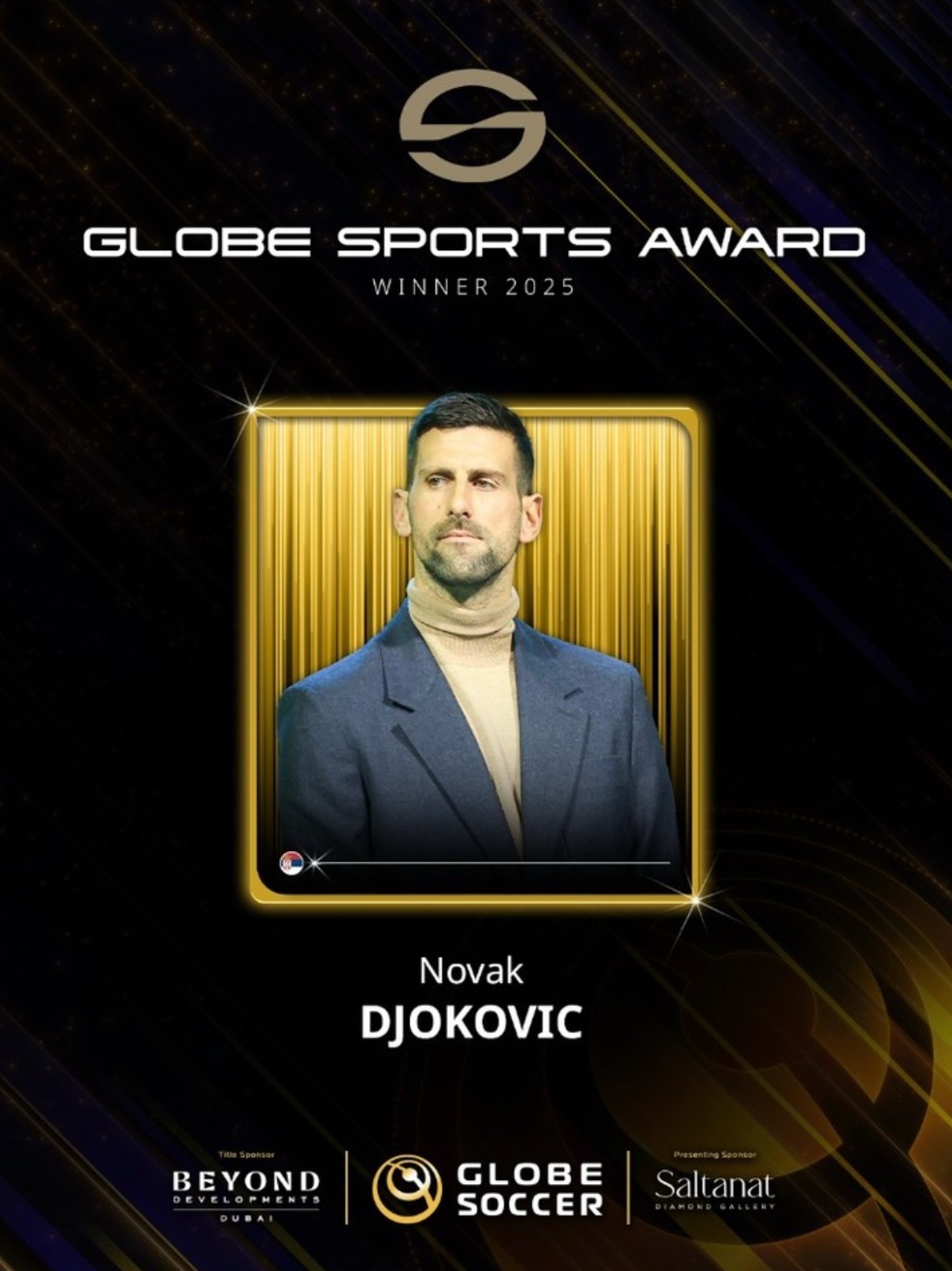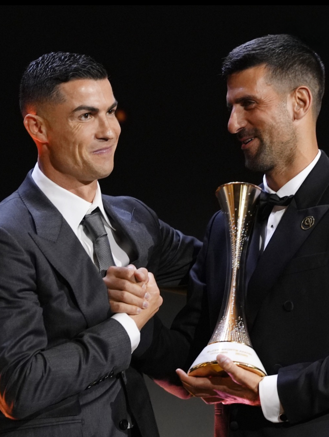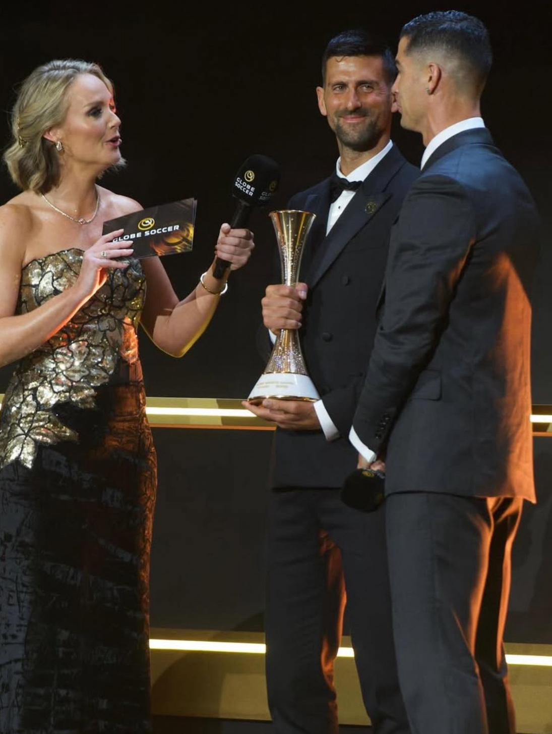 12月28日晚,环球足球颁奖典礼在迪拜举行,德约科维奇荣膺首届环球体育奖,连续三年获得最佳中东球员奖的C罗为德约颁奖。