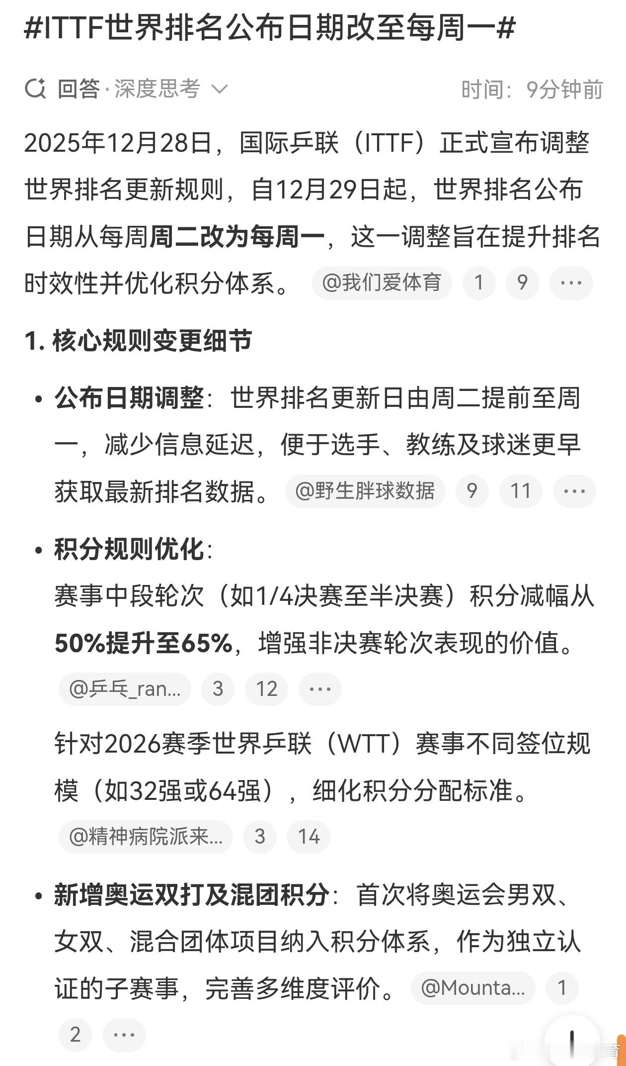 ITTF世界排名公布日期改至每周一新增双打个人积分排名,可以让更多的选手参与进来世界排名改成周一,更方便了,这次小改动总体来说,还可以