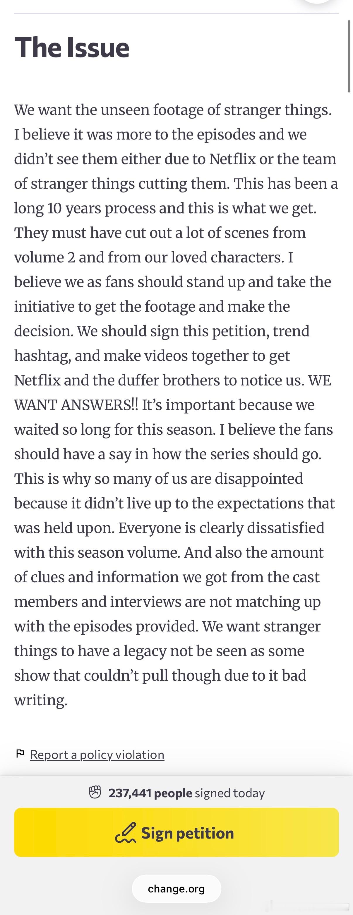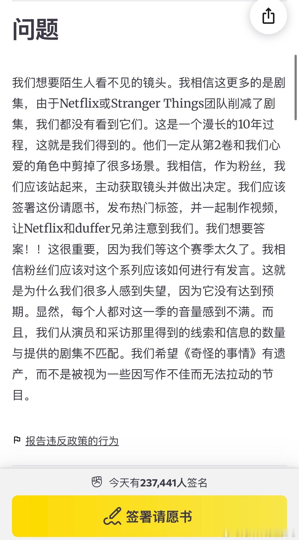 《怪奇物语》的粉丝集体联名向Netflix请愿,希望把第五季第二部分被删减的两个多小时情节到我打开这个网站的时候已经有27w人了,看起来真的很紧迫 怪奇物语第五季怪奇物语