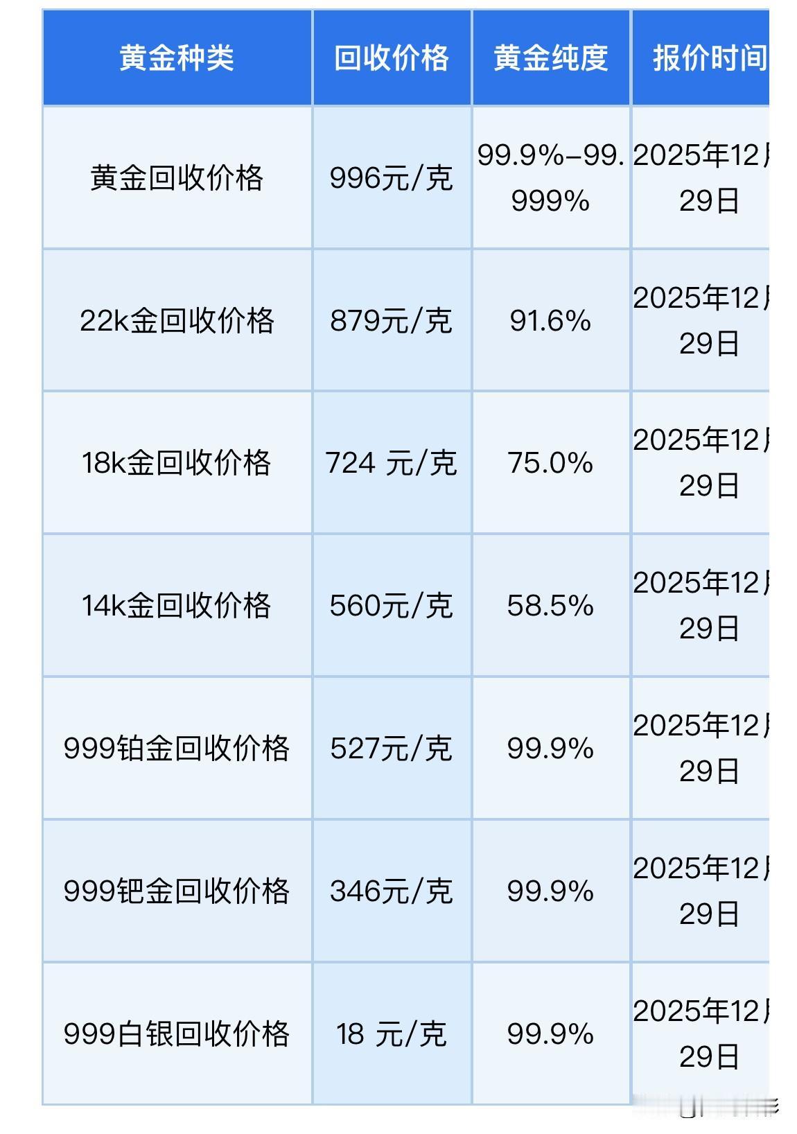 来看看! 今天黄金回收价格、铂金回收价格及白银回收价格是多少了? 黄金回收价格996元/克, 999铂金回收价格527元/克, 999白银回收价格18 元/克。 同比于前天黄金价格及铂金价格有所下降,其足金、18k金回收价格分别下降了2元。22k金、14k金回收价格分别下降了1元。铂金回收价格下降了6元/克。钯金回收价格下降了28元/克。白银回收价格保持不变。 温馨提示:不同地区、不同回收商的价格可能会有所不同。 1、黄金回收价格主要受到国际金价影响,与黄金纯度、黄金重量等因素有关; 2、黄金回收价格与品牌、新旧等是无关的; 3、黄金回收是没有折旧费和损耗费的。 所有信息都只是提供参考价值! 购买黄金有风险,请大家保持理性购买黄金,不要盲目跟风! 金价回收行情 黄金白银价格 黄金一克720 黄金回收价攀升 铂金价格 黄金价格680 铂金回收行情