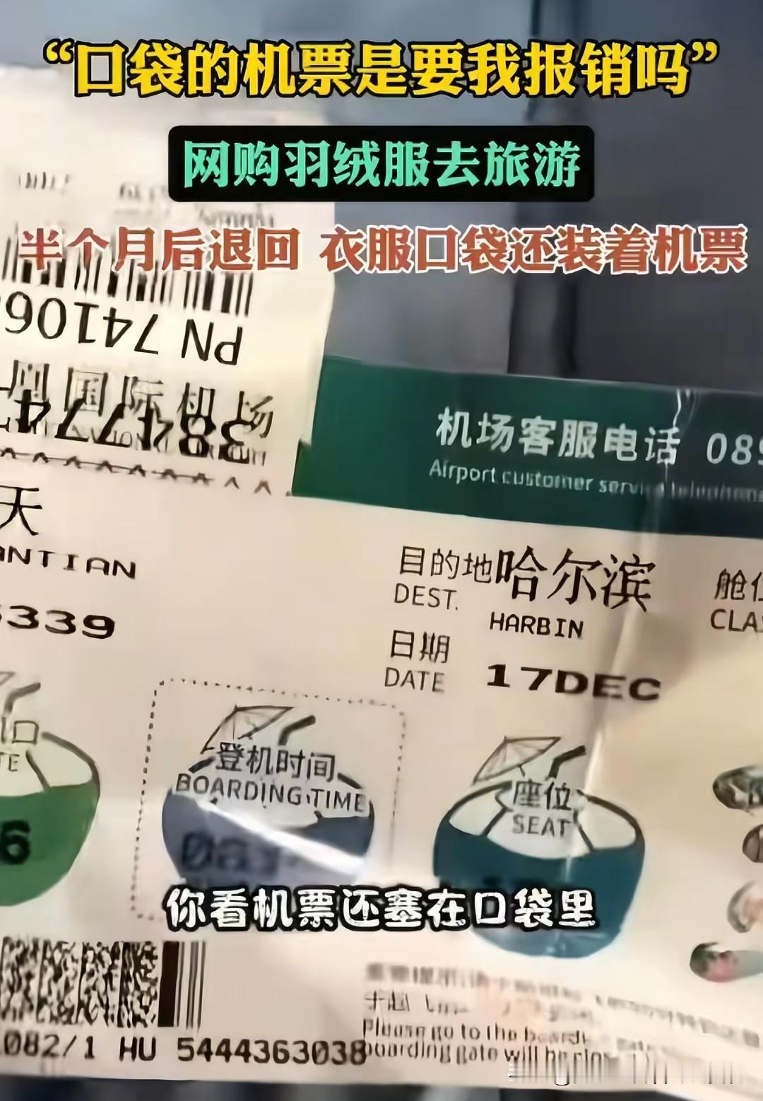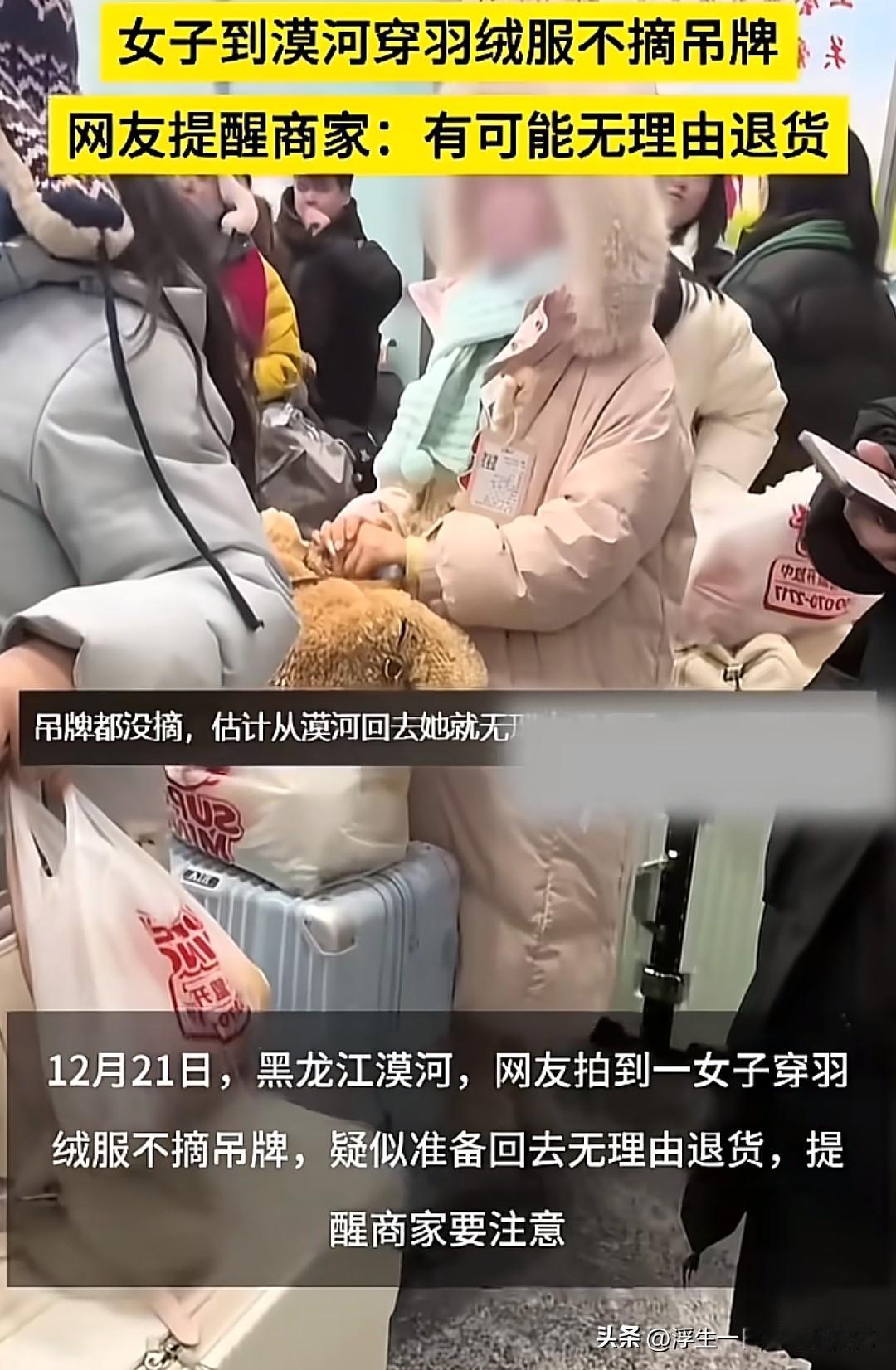 全网都在找苏女士,活不起,是真的活不起了,在海南网购羽绒服去东北旅游,穿完反手就是一个退货,这操作神奇了,白嫖都这么毫无底线了吗?更离谱的是,机票还在口袋里,这是白嫖的证据! 之前就有很多像苏女士这样的南方游客,穿的羽绒服都带有吊牌,等自己旅游结束再把衣服退掉,一分钱也没花,直接白嫖!她们不会觉得有什么不妥,甚至还觉得自己穿出去很爱惜,没有磕碰,也没有任何污渍,穿完后原封不动的寄回,已经正常不过了。 如果白嫖成为流行,那她们就不需要买任何一件衣服了,每天都可以穿各种衣服,穿完一件退货一件,完全可以做到365天不重样。 建议各网络平台不要搞什么7天无理由退货,如果衣服不能穿收到当天就应该必须退回,或者改为24小时退货。这个7天无理由就是个漏洞坑商家的,如果衣服码数不对或者有质量问题一打开马上就知道了何必要等一个星期呢!
