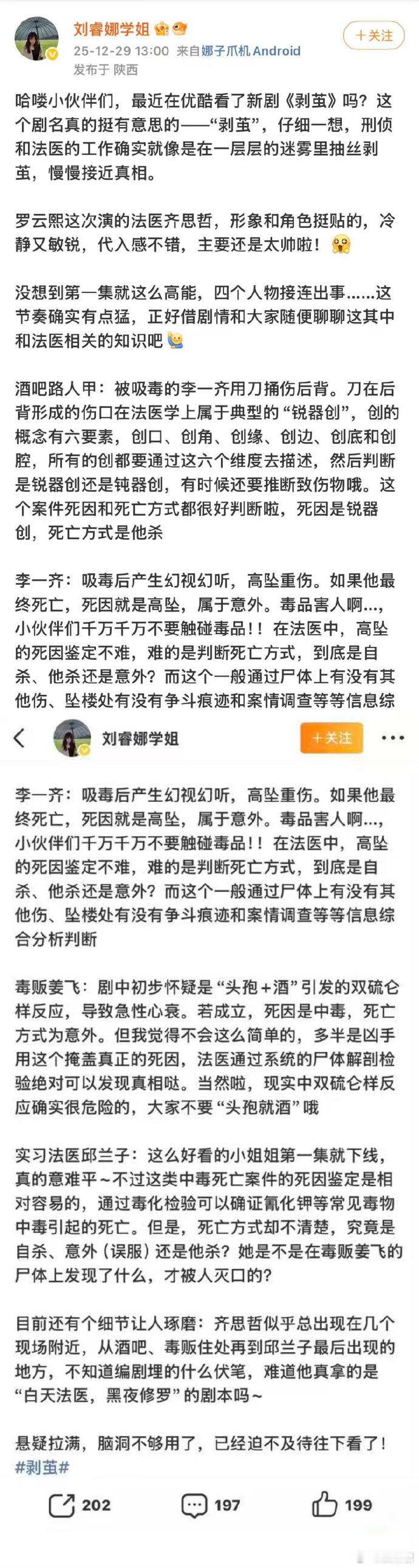 剥茧给法医学学生划重点了 被《剥茧》的严谨性征服!法医认证剧中验尸流程规范,镊子夹皮肤碎屑、显微镜观细胞异变超写实,凭藻类锁抛尸地,知识点硬核十足! 剥茧2025娱乐年终盘点