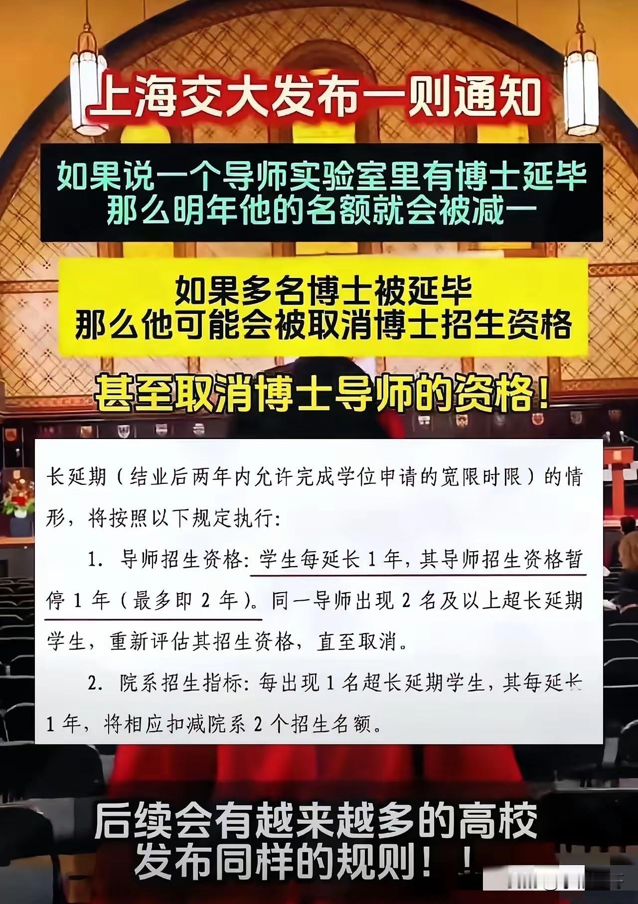 我预料到了交大会整治延毕问题 也预料到了会触动导师的利益 万万没想到惩罚直接挂钩招生资格,下手这么准这么狠 实验室里熬夜的博士生,电脑屏的光打在他疲惫的脸上。他手里的数据像是永远做不完。以前导师可能不在意学生延期,毕竟不影响自己的课题进度。现在不一样了,新规让导师的招生名额和学生的毕业时间牢牢绑在一起。一个学生超长延期,导师下一年就少一个招生指标;两个学生超期,导师可能直接被暂停招生。导师们最看重的就是招生名额,这是他们实验室运转的根基。 我认识的一位博士生,读了五年,导师换了好几个横向课题,每个都和他的博士论文方向关系不大。他像个打杂的,毕业的事导师只说你自己想办法。现在新规下来,导师主动找他讨论论文进度了。他的时间终于被看见了。