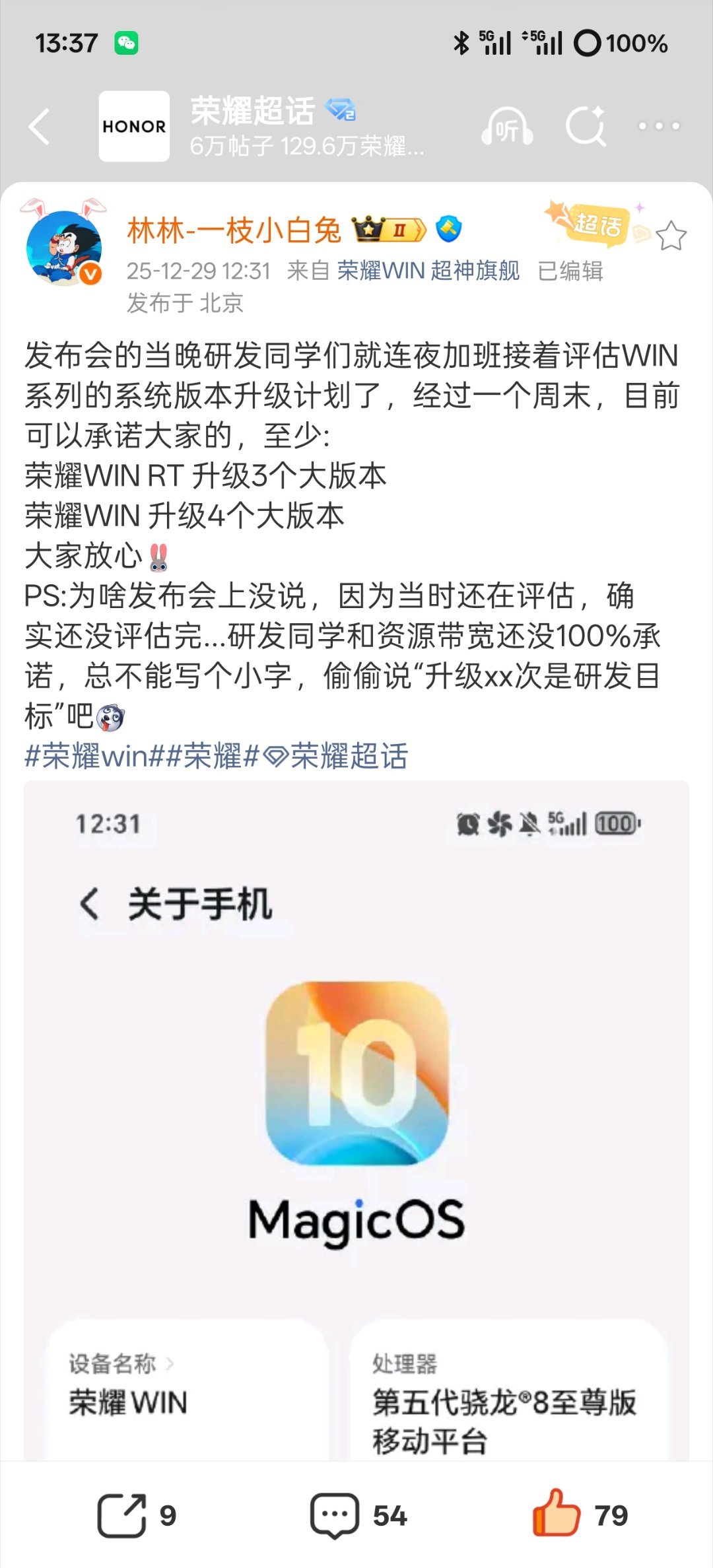 【荣耀 WIN 系列手机系统升级计划公布:目前承诺 RT 至少三个大版本、WIN 四个】荣耀中国区智慧生活业务部部长林林分享了 WIN 系列手机评估后的系统版本升级计划,目前可以承诺的“至少”:荣耀 WIN RT 升级 3 个大版本荣耀 WIN 升级 4 个大版本荣耀 WIN / WIN RT 手机已于 12 月 26 日下午正式发布,分别搭载第五代骁龙 8 至尊版和骁龙 8 至尊版处理器,并全系内置 10000mAh 巨无霸青海湖电池,定价 3999 元 / 2599 元起。荣耀win