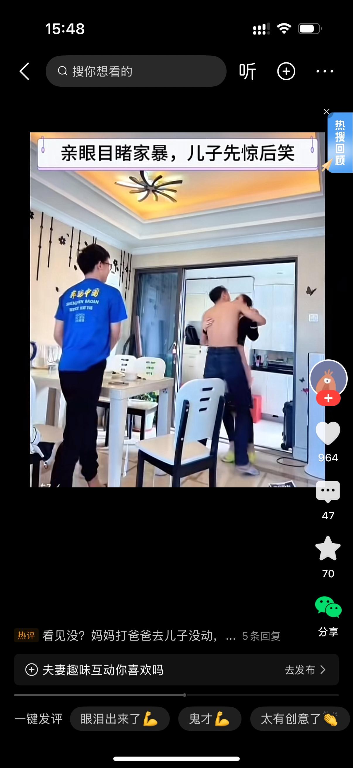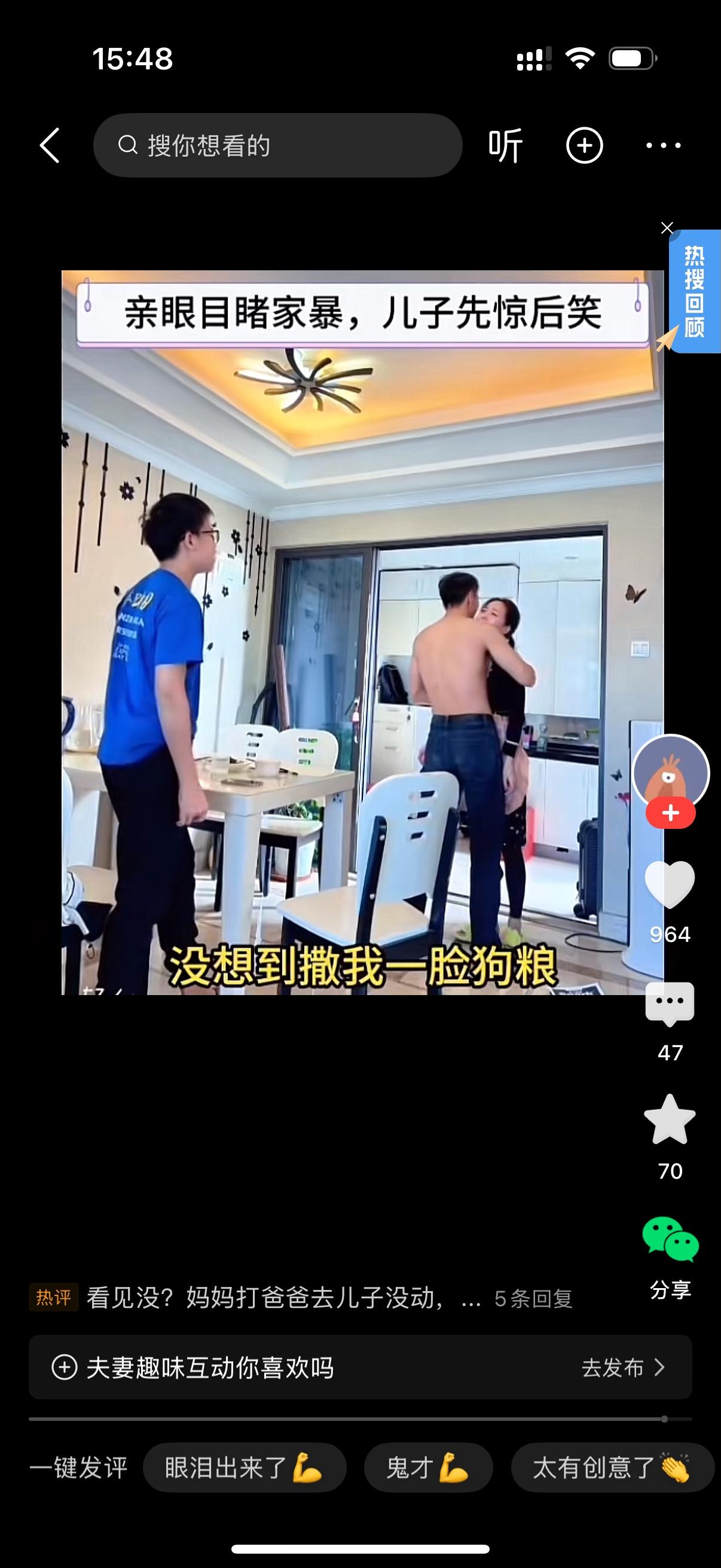 妈妈拿起一本书朝爸爸身上使劲砸。男人刚开始没动,女人继续不停地砸。男人忍无可忍,直接脱掉上衣,朝女人走去。儿子以为父亲要揍母亲,站了起来。可爸爸却光着膀子抱住母亲狂亲不止。儿子都有点尴尬,只能说,我以为你要蘸我一身血,没想到撒了我一脸狗粮。