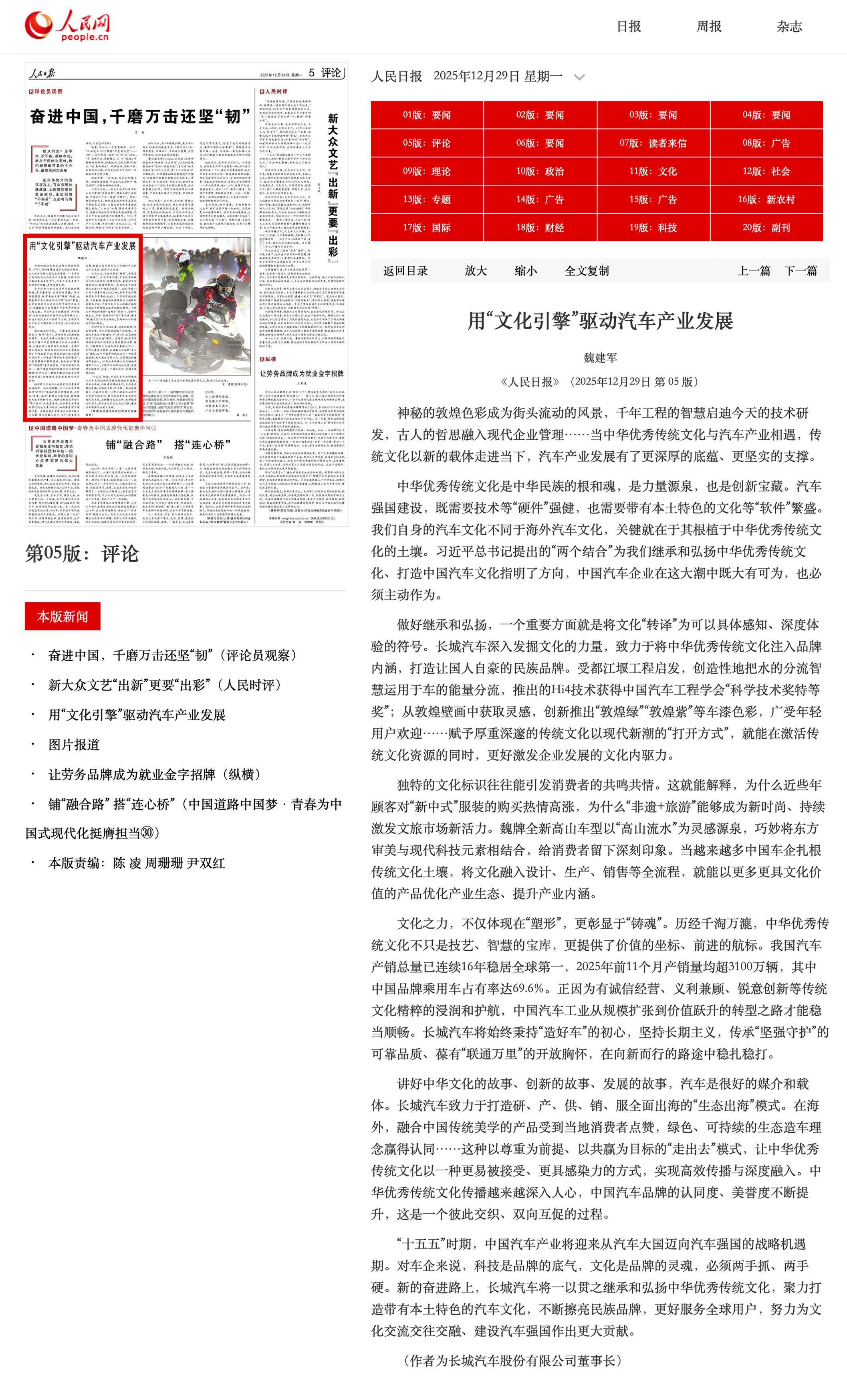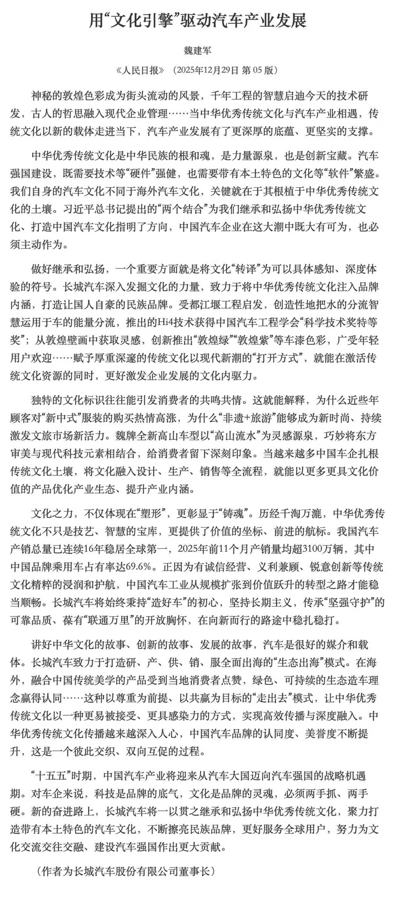 以前觉得车就是个代步工具,但最近看到长城汽车的一些动作,想法有点变了。看到魏建军署名文章登上《人民日报》评论版,提出的“文化引擎”让人耳目一新。这让我感觉,一个品牌开始注重文化,它的产品也会更有温度和故事感。今年长城汽车多次上人民日报,从头版到评论版,这个频率在车企里真的很少见了。魏总说的“文化引擎”虽然听着高大上,但落到咱们车主身上,其实可感可知:从敦煌色系的车身设计,到源于都江堰智慧的Hi4-Z架构,长城汽车确实在走一条注重文化底蕴的差异化道路。用文化厚度支撑发展长度,这个思路挺有意思的,不知道会不会成为行业新趋势,央媒评论版刊登魏建军署名文章 对此你们怎么看?