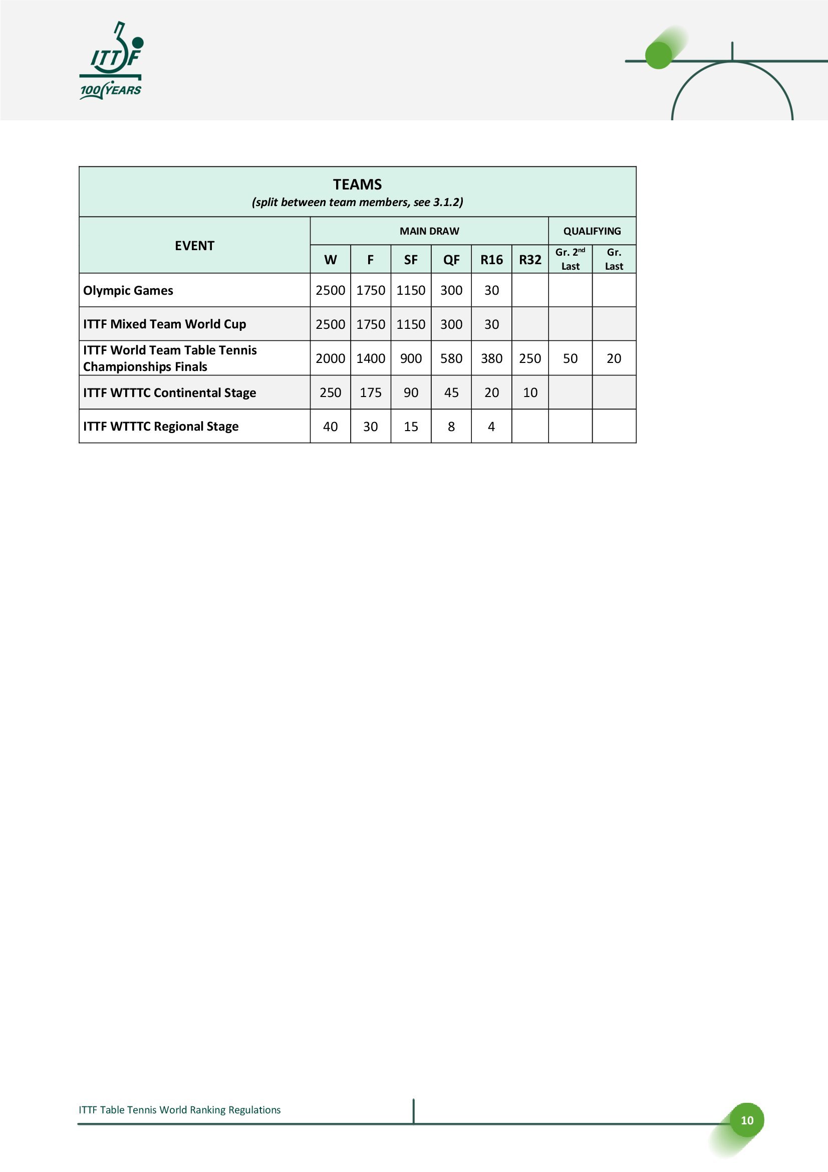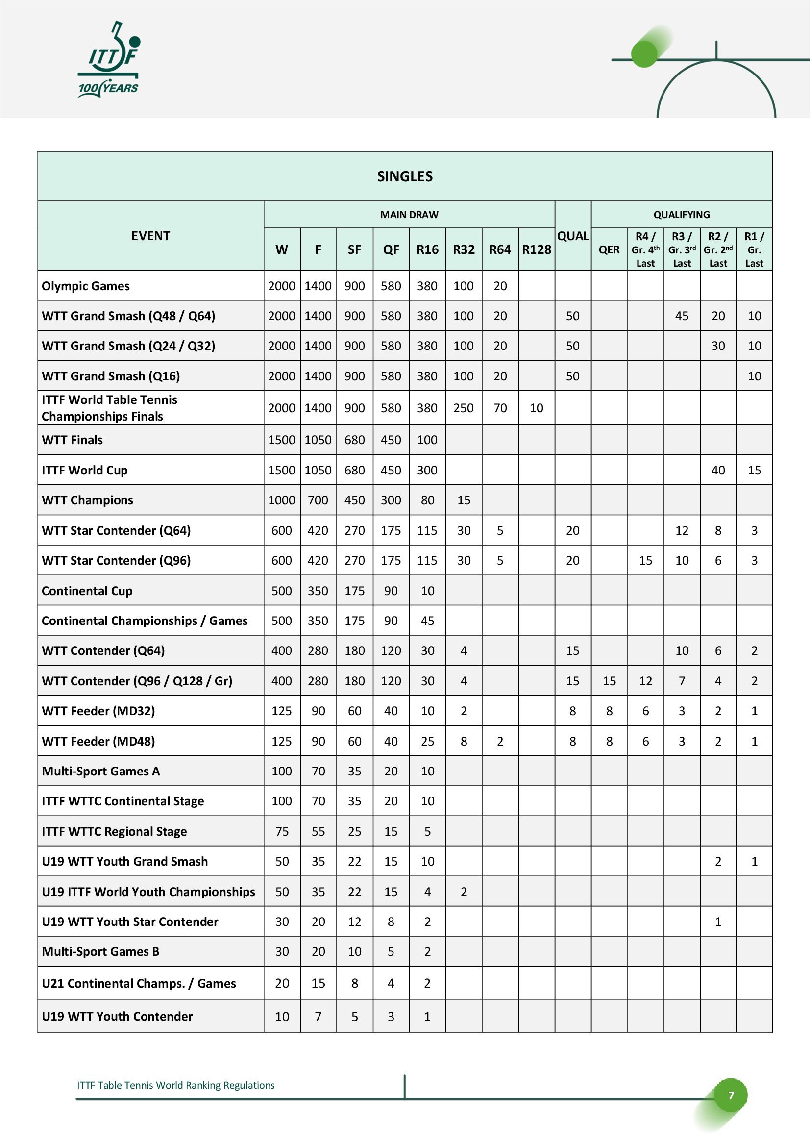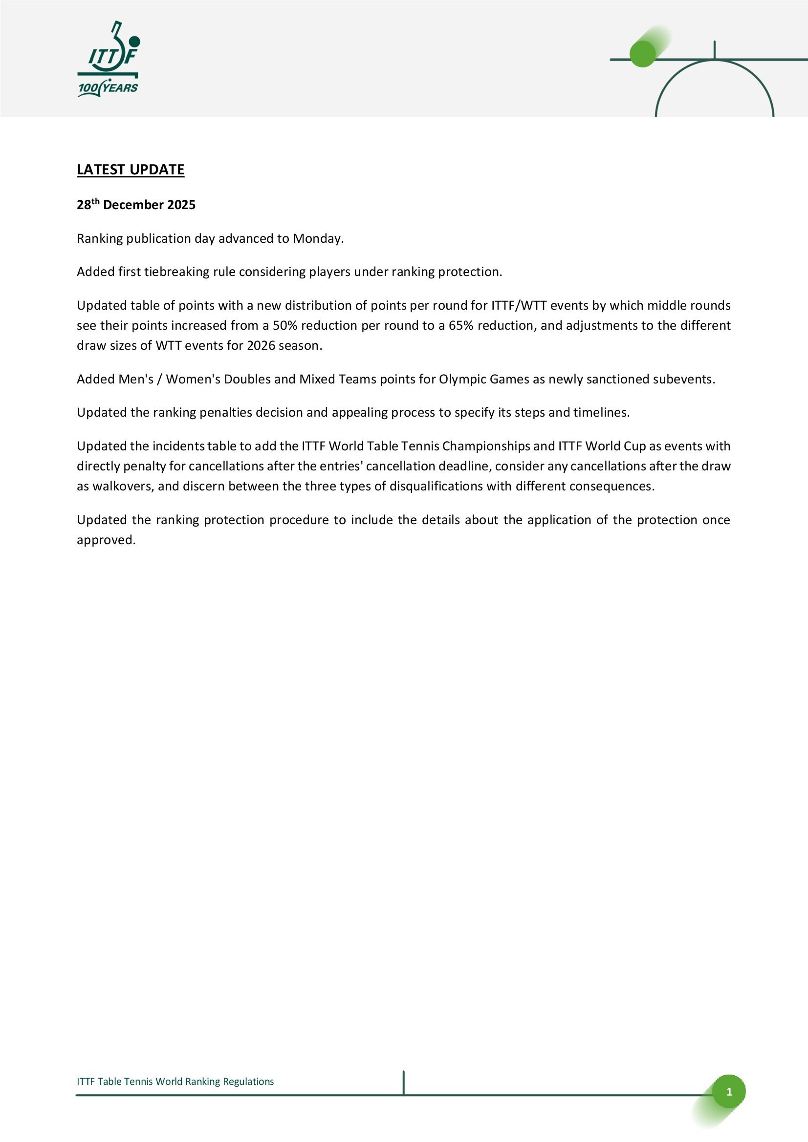 国际乒联世界排名规则丨2025.12.28更新🔘世界排名公布提前至周一🔘更新积分表,调整国际乒联/世界乒乓球职业联赛赛事每轮积分分配,其中中间轮次的积分减少幅度由每轮减少50%调整为减少65%,并对2026赛季WTT赛事的不同签位规模进行调整。📈2026部分赛事四强至第二轮积分变化示例,/后为原积分,↓为新积分减少【国际乒联单打世界杯】单打丨四强680/525丨八强450/265丨十六强300/130【WTT大满贯】单打丨四强900/700丨八强580/350丨十六强380/175丨三十二强100/90双打丨四强900/700丨八强580/350丨十六强150↓/175【WTT总决赛】单打丨四强680/525丨八强450/265混双丨四强270↓/525(*赛制变更)【WTT冠军赛】单打丨四强450/350丨八强300/175丨十六强80↓/90【WTT球星挑战赛】单打丨四强270/210丨八强175/105丨十六强115/55丨三十二强30/25双打丨四强270/210丨八强70↓/105【WTT常规挑战赛】单打丨四强180/140丨八强120/70丨十六强30/35↓双打丨四强180/140丨八强45↓/70🔘新增奥运会男女双打和混合团体积分🔘更新排名处罚决定和申诉流程,明确其步骤和时间表。更新将国际乒联世界乒乓球锦标赛和国际乒联世界杯列为在报名截止日期后取消参赛将直接受到处罚赛事;将抽签后取消参赛视为弃权;并区分三种不同后果的取消资格类型。