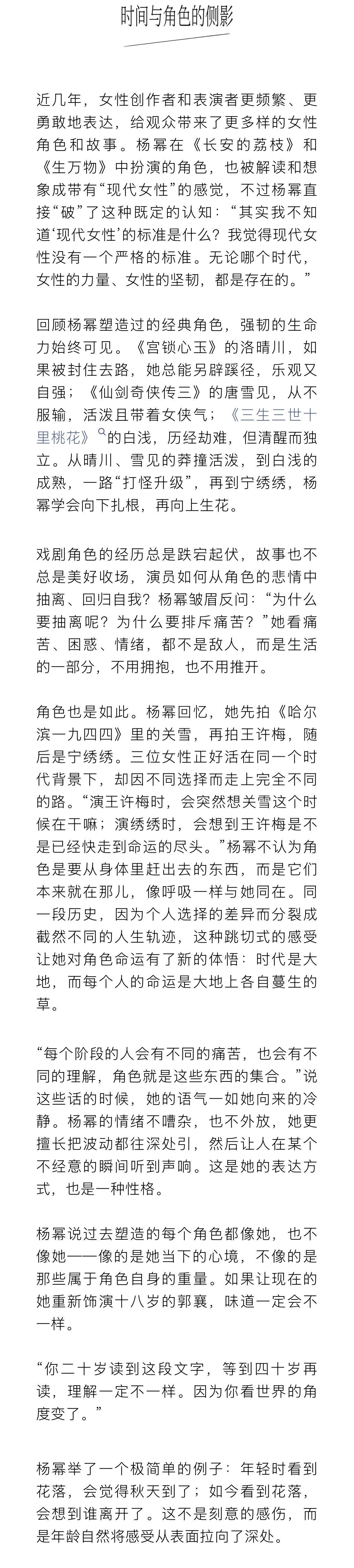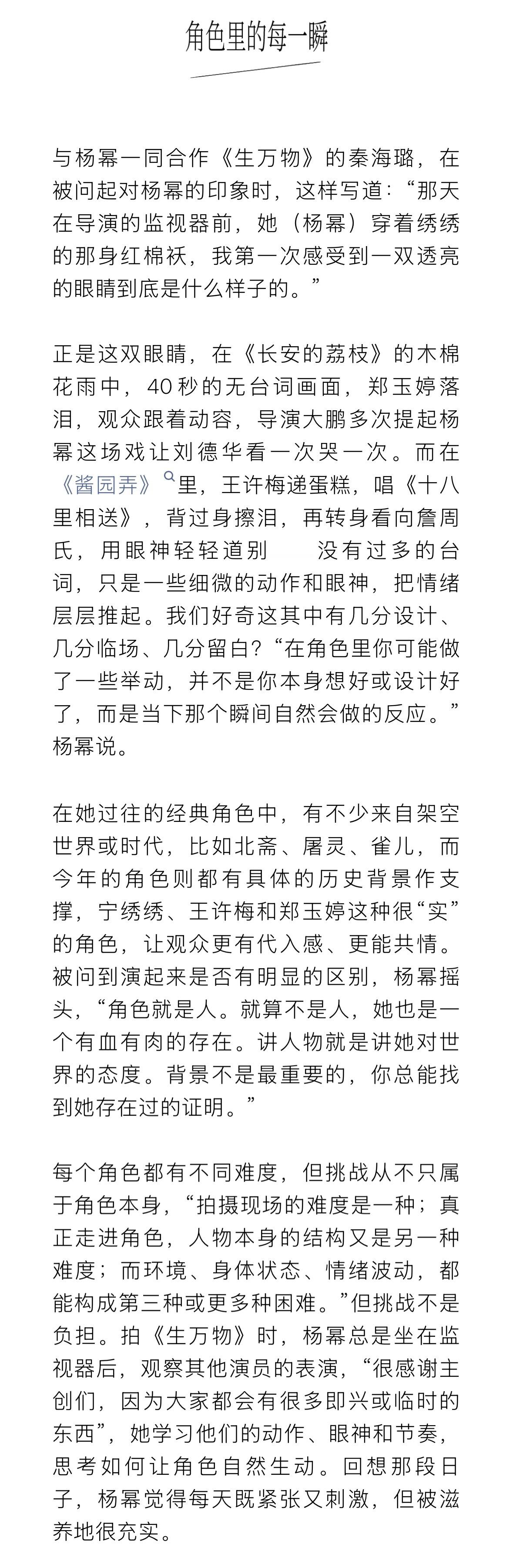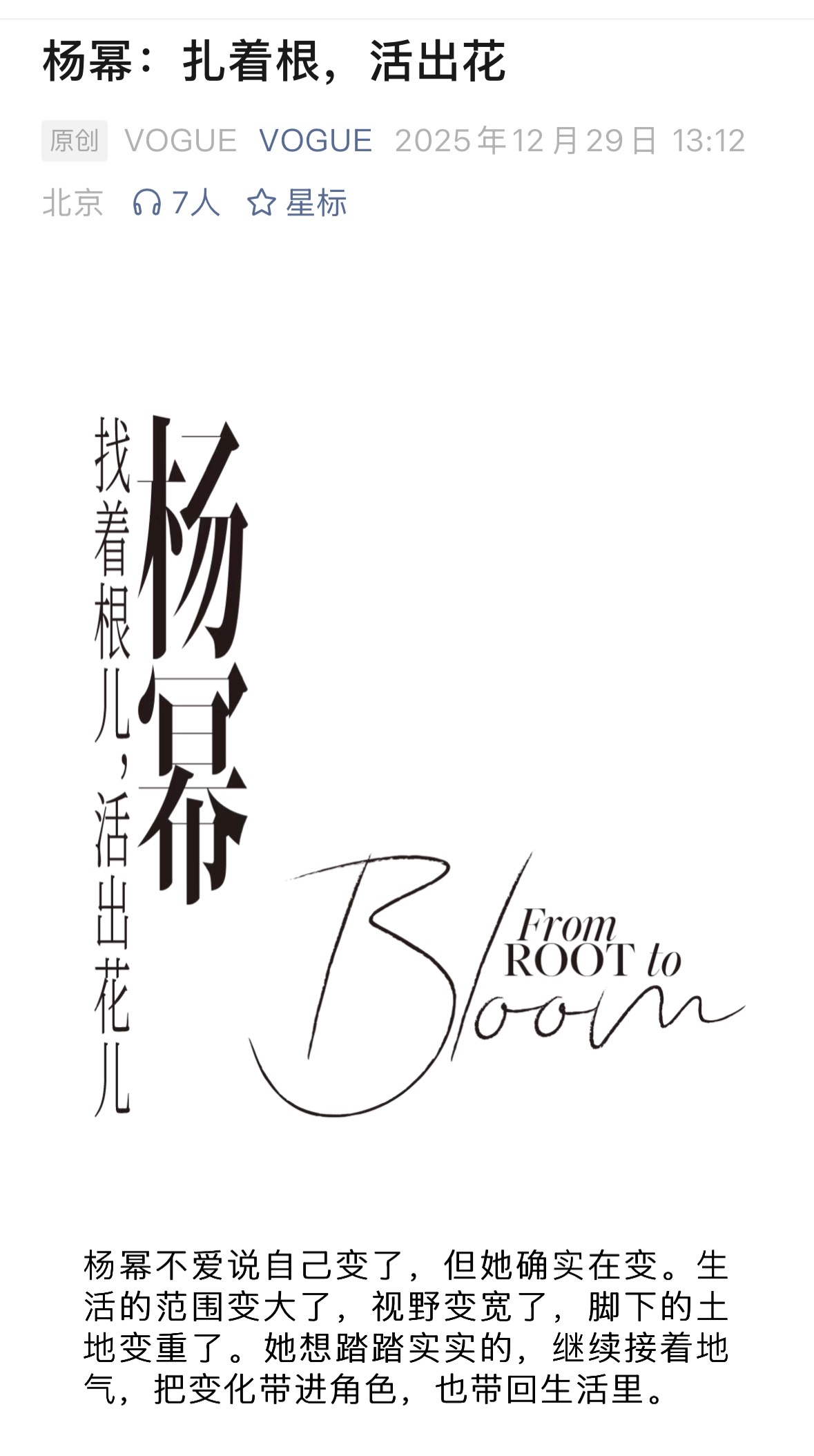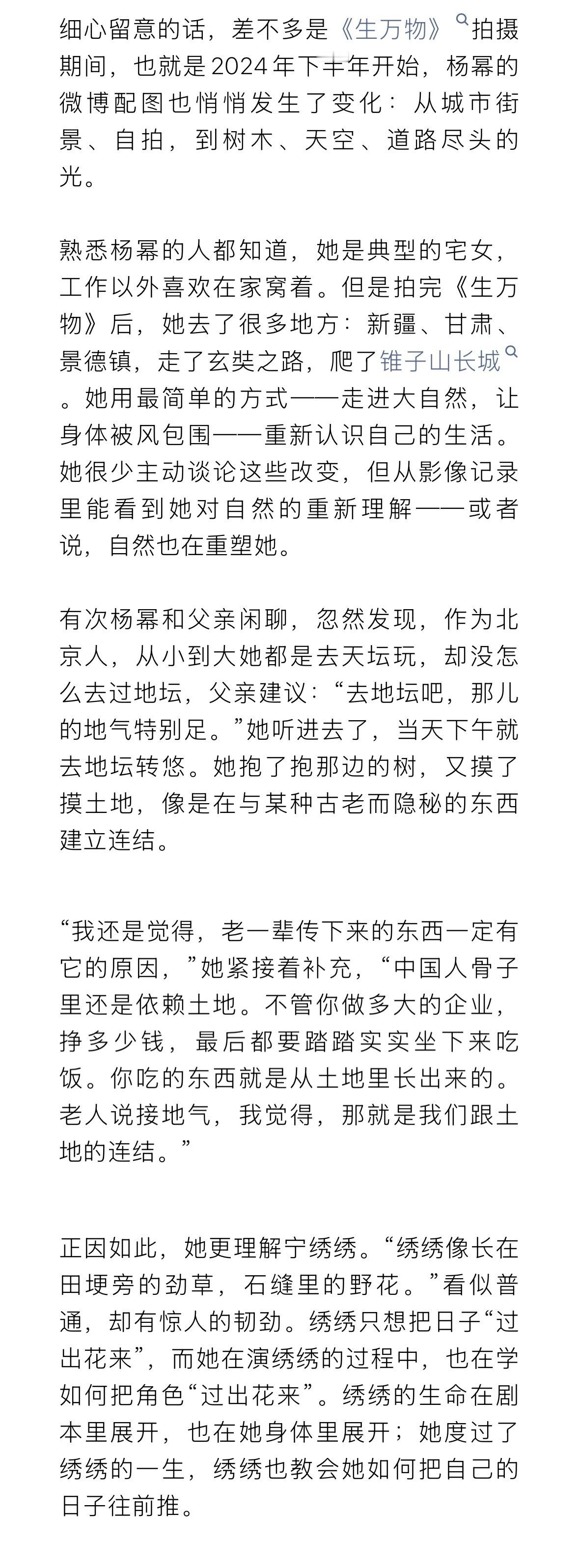杨幂 vogue杨幂vogue开年刊封面 杨幂采访【杨幂:扎着根,活出花】(很有哲思的一段文字)当天的晚霞美得令人屏息,整片天空的色彩柔和又浓烈,杨幂说自己看着那一刻,把这份幸运和光景都收进了心里。小林哥建议去地坛,那儿地气很足。杨幂说“中国人骨子里还是依赖土地。老人说接地气,我觉得,那就是我们跟土地的连结。”她更理解宁绣绣,她像长在田埂旁的劲草,石缝里的野花。”看似普通,却有惊人的韧劲。绣绣只想把日子“过出花来”,而她在演绣绣的过程中,也在学如何把角色“过出花来”。拍《生万物》时,杨幂总是坐在监视器后,观察其他演员的表演,“很感谢主创们,因为大家都会有很多即兴或临时的东西”,她学习他们的动作、眼神和节奏,思考如何让角色自然生动。回想那段日子,杨幂觉得每天既紧张又刺激,但被滋养地很充实。我觉得现代女性没有一个严格的标准。无论哪个时代,女性的力量、女性的坚韧,都是存在的。戏剧角色经历跌宕起伏,她认为痛苦、困惑、情绪,都不是敌人,而是生活的一部分,不用拥抱,也不用推开。演王许梅会想到关雪,演绣绣时会想到王许梅。杨幂不认为角色是要从身体里赶出去的东西,而是它们本来就在那儿,像呼吸一样与她同在。杨幂不再给自己设限。除去拍戏的时间,现在的杨幂喜欢让自己静静观察和感受。戏剧和现实,总是相互映照。观察现实,是为了让角色更有真实感;体验角色,又能让你重新理解现实“既然决定往前走,那我们就不回头。”“我们不去预设,但是可以允许自己为自己做出的决定和选择去负责,前方有什么都没关系。”