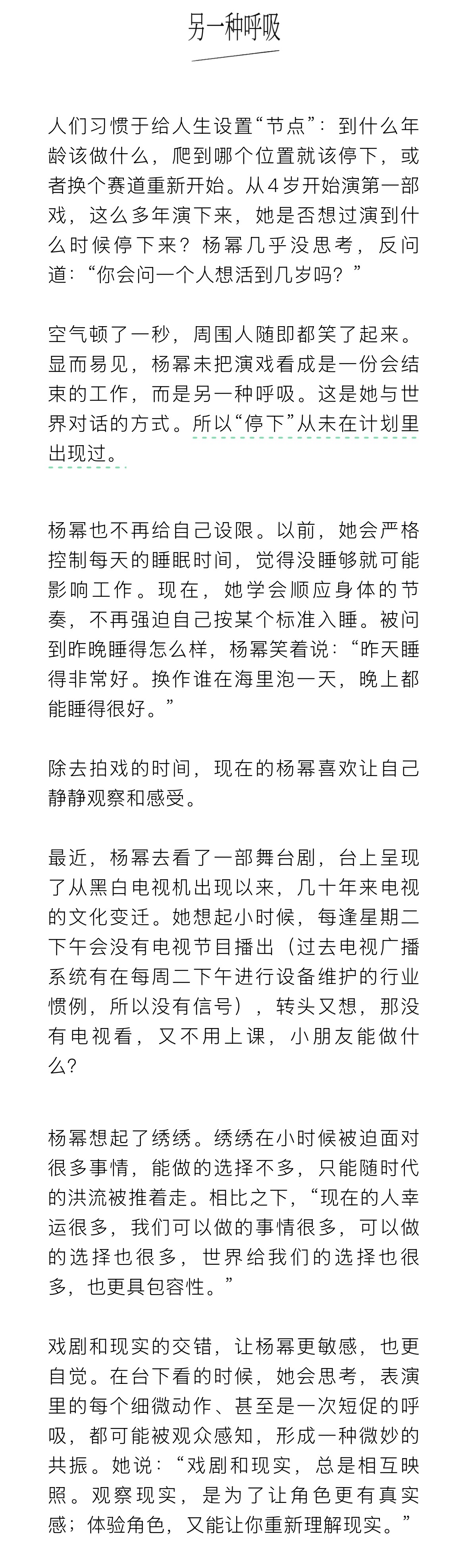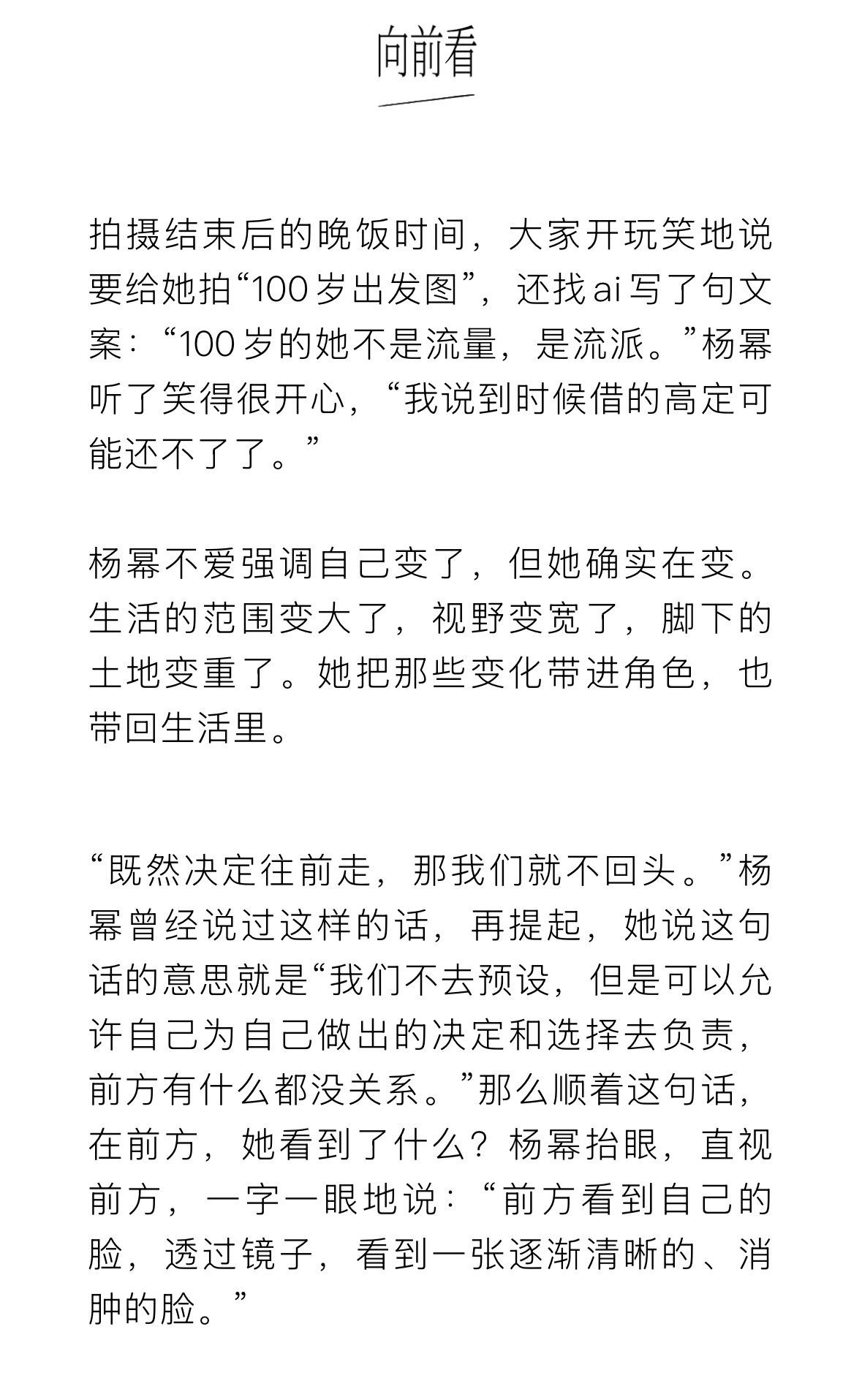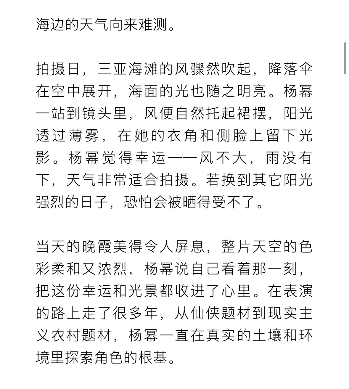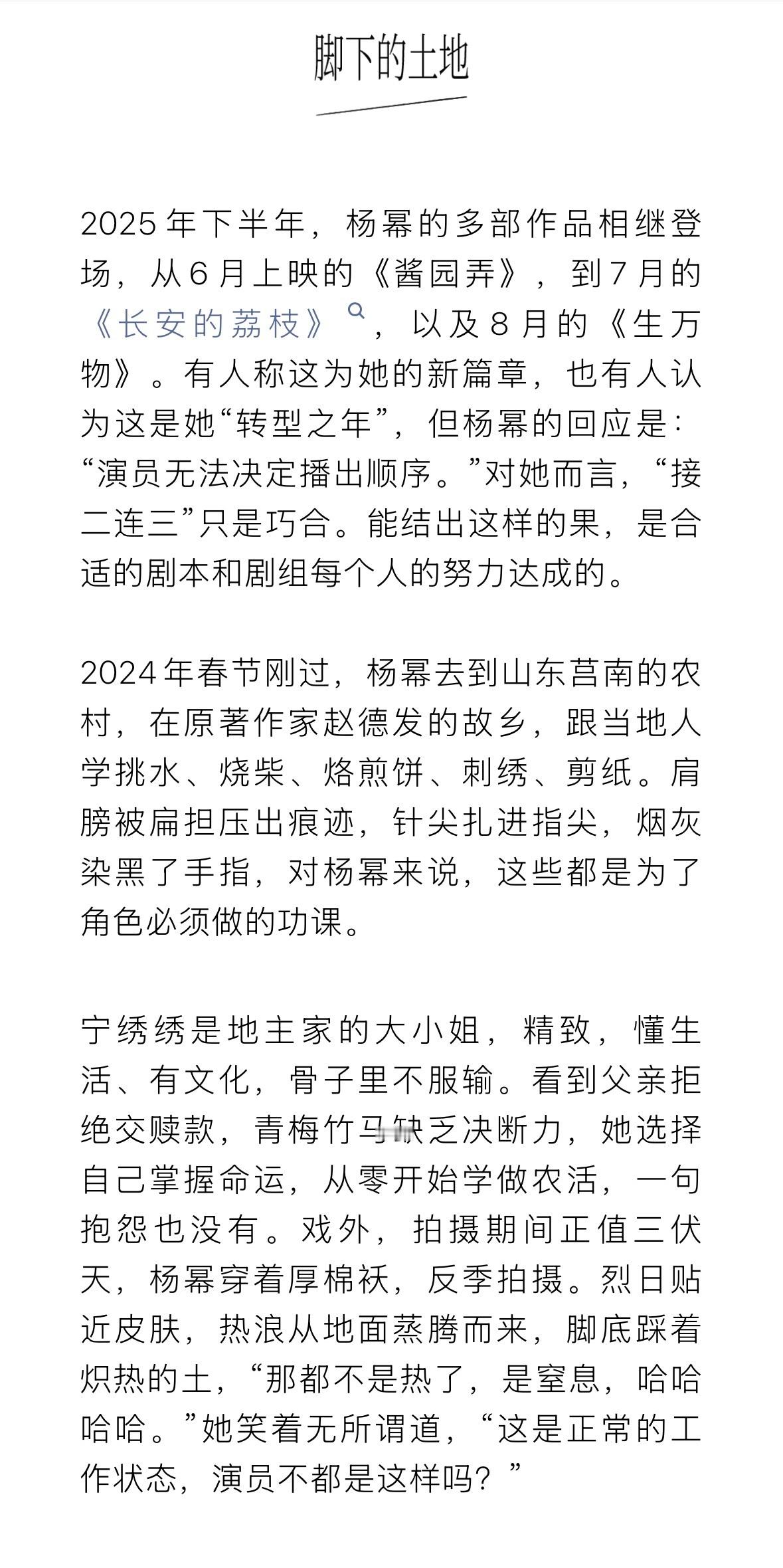 杨幂 vogue杨幂vogue开年刊封面 杨幂采访【杨幂:扎着根,活出花】(很有哲思的一段文字)当天的晚霞美得令人屏息,整片天空的色彩柔和又浓烈,杨幂说自己看着那一刻,把这份幸运和光景都收进了心里。小林哥建议去地坛,那儿地气很足。杨幂说“中国人骨子里还是依赖土地。老人说接地气,我觉得,那就是我们跟土地的连结。”她更理解宁绣绣,她像长在田埂旁的劲草,石缝里的野花。”看似普通,却有惊人的韧劲。绣绣只想把日子“过出花来”,而她在演绣绣的过程中,也在学如何把角色“过出花来”。拍《生万物》时,杨幂总是坐在监视器后,观察其他演员的表演,“很感谢主创们,因为大家都会有很多即兴或临时的东西”,她学习他们的动作、眼神和节奏,思考如何让角色自然生动。回想那段日子,杨幂觉得每天既紧张又刺激,但被滋养地很充实。我觉得现代女性没有一个严格的标准。无论哪个时代,女性的力量、女性的坚韧,都是存在的。戏剧角色经历跌宕起伏,她认为痛苦、困惑、情绪,都不是敌人,而是生活的一部分,不用拥抱,也不用推开。演王许梅会想到关雪,演绣绣时会想到王许梅。杨幂不认为角色是要从身体里赶出去的东西,而是它们本来就在那儿,像呼吸一样与她同在。杨幂不再给自己设限。除去拍戏的时间,现在的杨幂喜欢让自己静静观察和感受。戏剧和现实,总是相互映照。观察现实,是为了让角色更有真实感;体验角色,又能让你重新理解现实“既然决定往前走,那我们就不回头。”“我们不去预设,但是可以允许自己为自己做出的决定和选择去负责,前方有什么都没关系。”