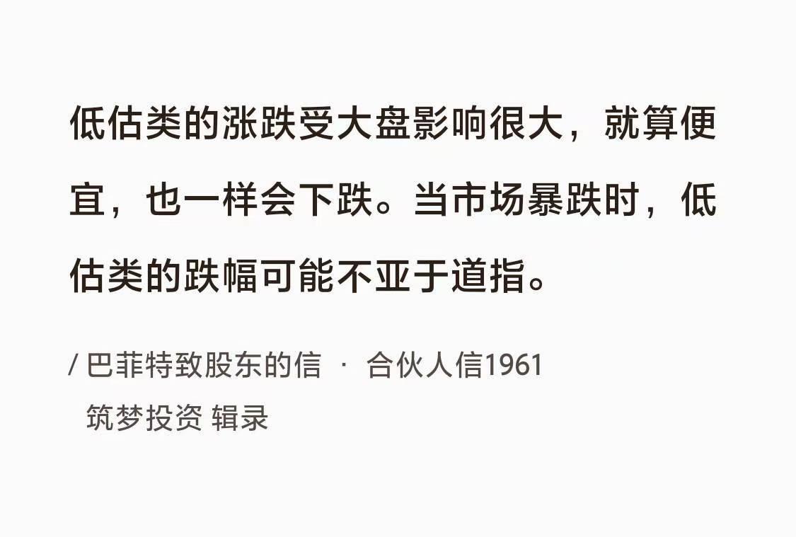 巴菲特曰:“低估类的涨跌受大盘影响很大,就算便宜,也一样会下跌。当市场暴跌时,低估类的跌幅可能不亚于道指。”